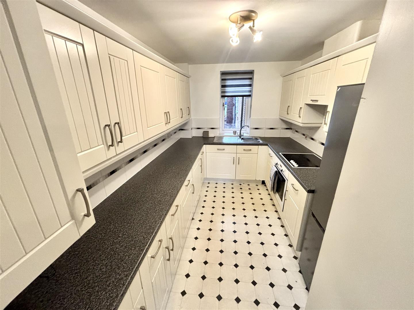 Fitted with a comprehensive range of wall and floor units having contrasting worksurfaces incorporating a sink and drainer unit with mixer tap, built in electric oven and hob with extractor over, an integrated washer/dryer and freestanding fridge/freezer. Further features include a UPVC double glazed window, tiled splashbacks and unit housed gas central heating boiler.
