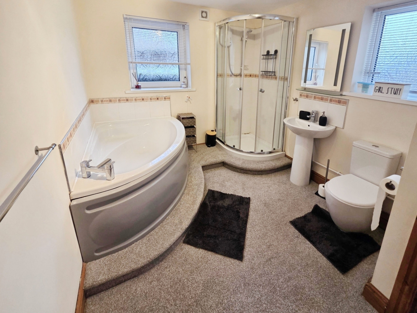 Upstairs, the property boasts three comfortable bedrooms, each offering ample natural light and flexible accommodation options. The large bathroom great, featuring a separate corner bath and a dedicated corner shower cubicle—perfect for unwinding after a day exploring the local area.