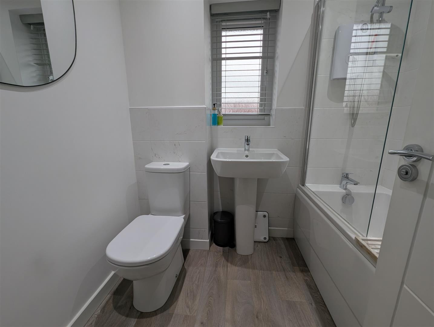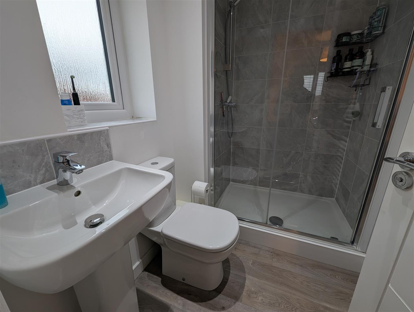 Upvc double glazed obscure window to side, walk in double shower, low level w.c, wash hand basin, heated towel rail and vinyl flooring.