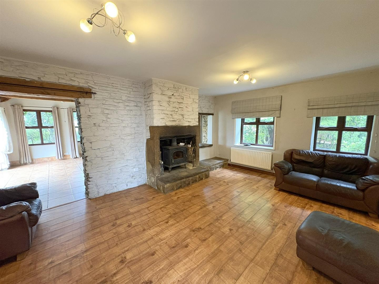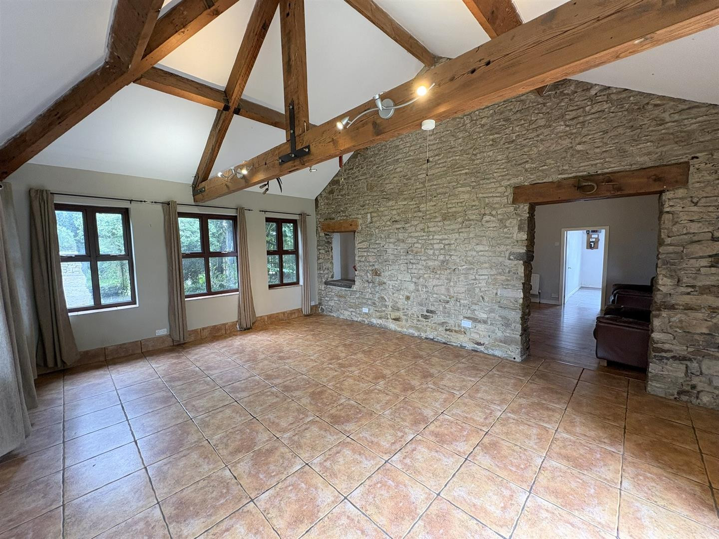 An exceptional lounge enjoying the outside from the comfort of your own home with views over the garden and countryside beyond via seven UPVC windows and sliding patio doors. A window opening into dining room with an original stone sill and wooden beam above.