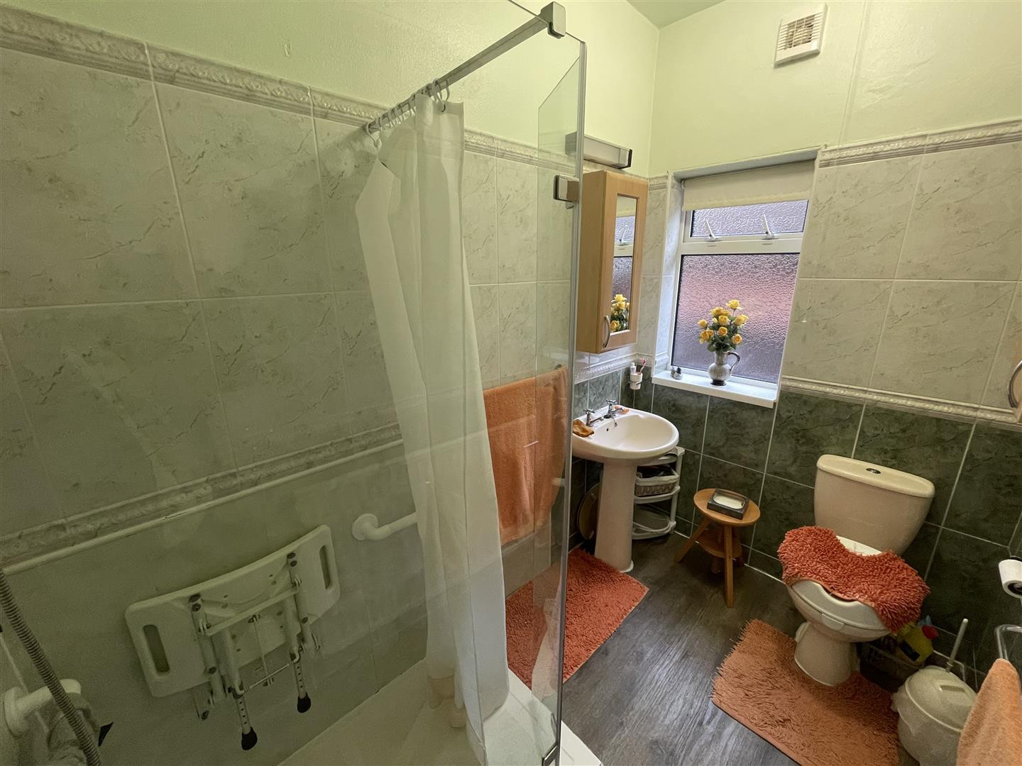 Upvc double glazed obscure window to side, large shower cubicle, wash hand basin, w.c and radiator. Part tiled walls and laminate floor.