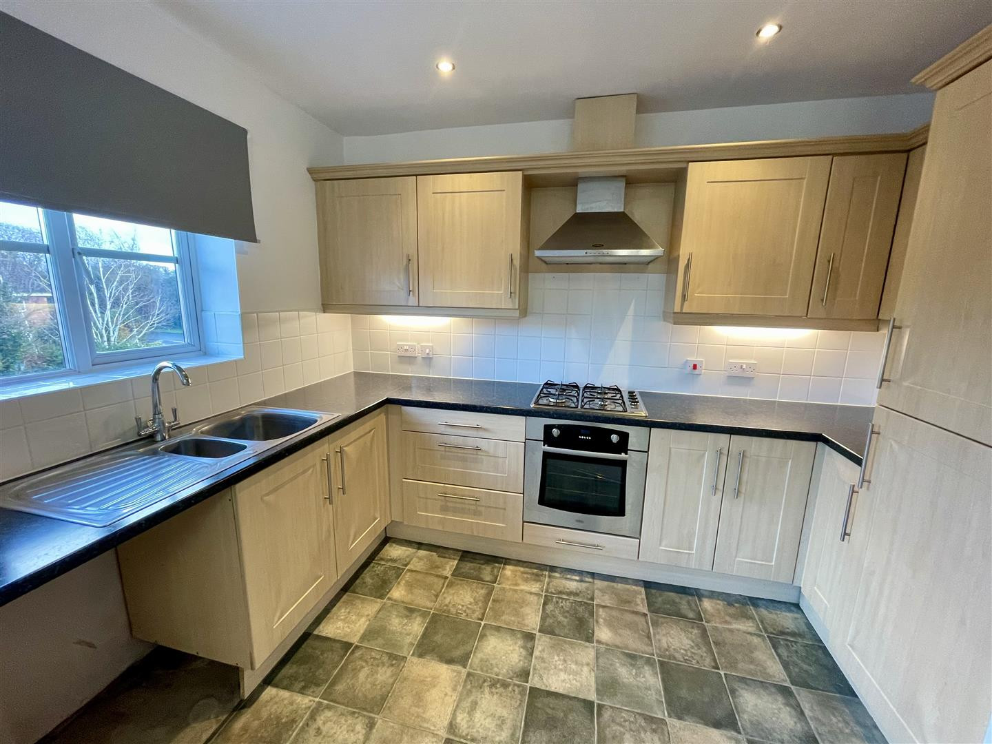 Kitchen area is fitted with light oak wall, base and drawer units, four ring gas hob with extractor over and oven, stainless steel sink with mixer tap, integrated fridge freezer and washer/dryer. Spotlights to ceiling and vinyl floor.
