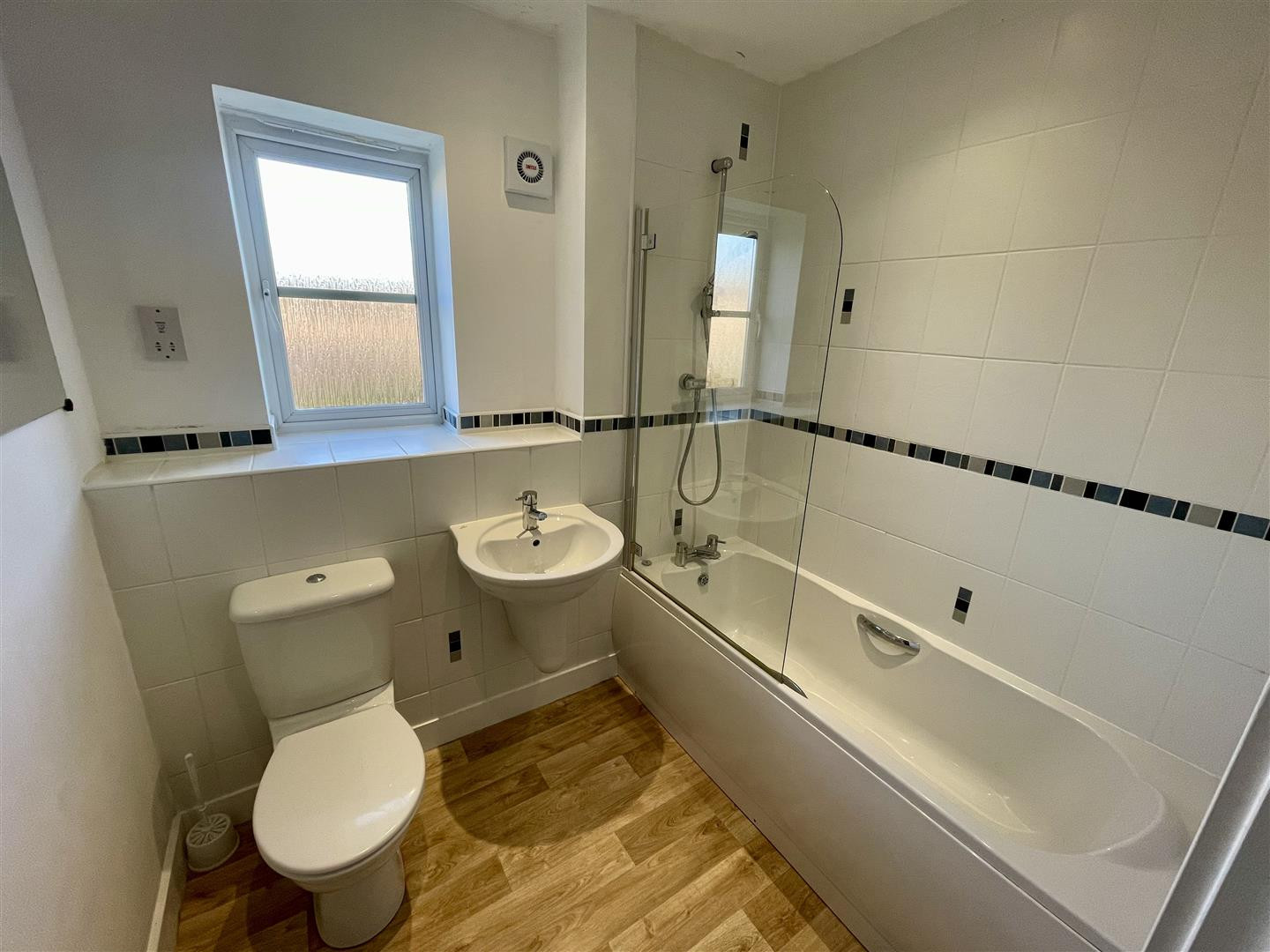 Upvc double glazed window to rear, panelled bath with shower over and screen. Low level w.c, wall mounted wash hand basin, part tiled walls and spotlights to ceiling.
