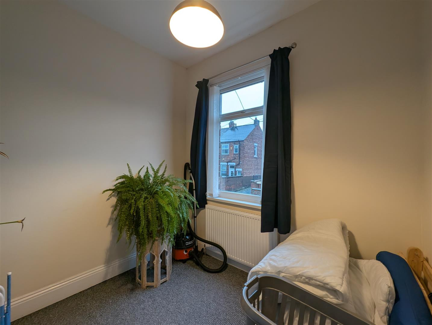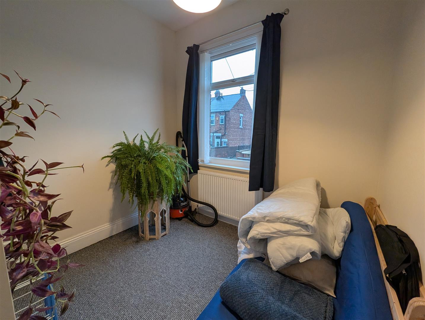 Upvc double glazed bay window to front, meter storage cupboard and radiator.
