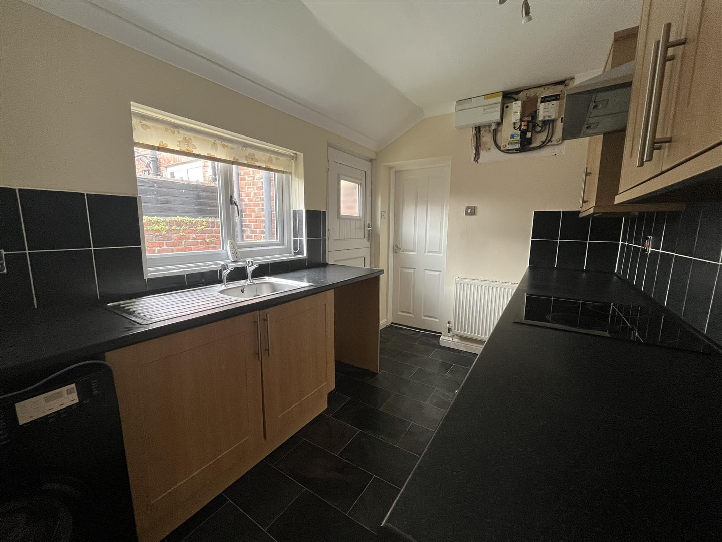 Fitted with a range of wall and base units with laminate work surfaces over, integrated electric oven and hob, plumbing for washing machine, space for fridge freezer, stainless steel sink unit with mixer tap, tiled splash backs, central heating radiator and uPVC stable door to rear yard.