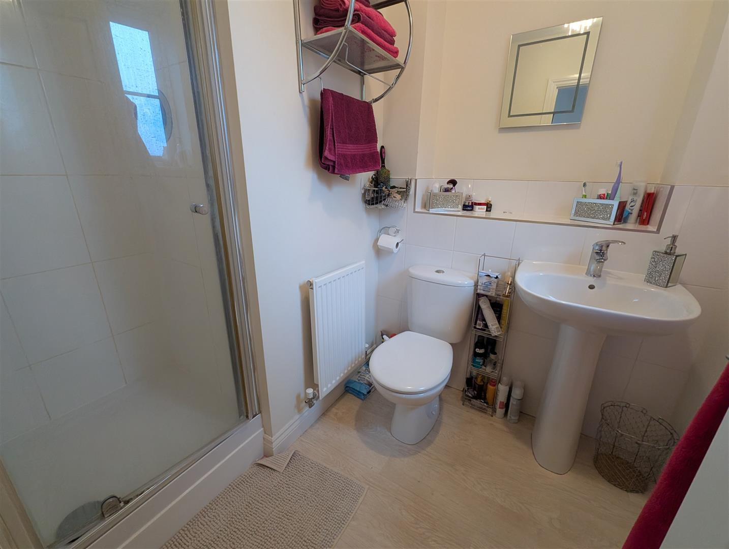 Upvc double glazed obscure window to front, shower cubicle, low level w.c and wash hand basin. Part tiled walls and radiator.
