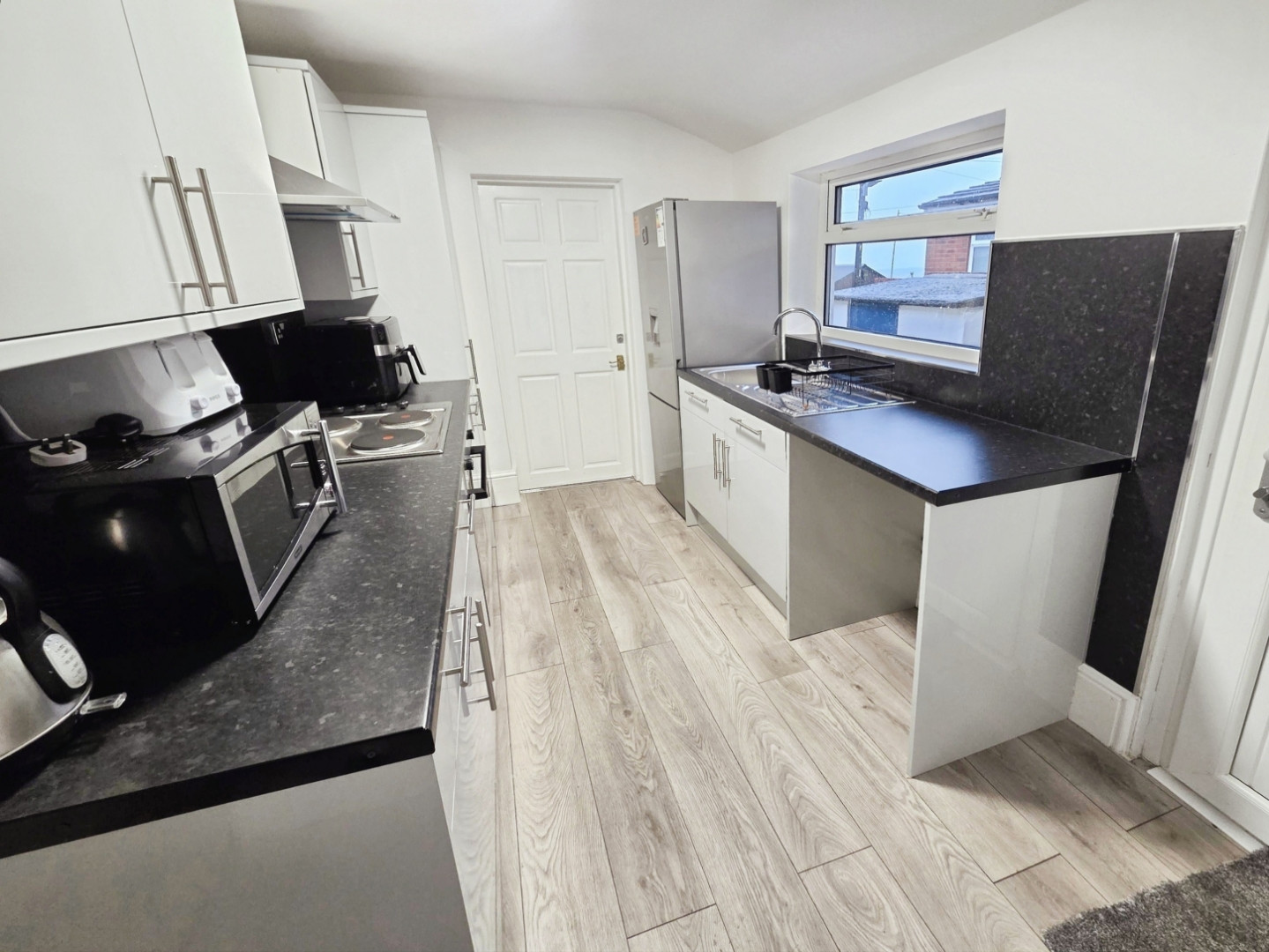 Fitted with grey wall and base units with contrasting work surfaces over, stainless steel sink unit with mixer tap, integrated electric oven and electric hob with extraction chimney over, plumbing for washing machine, space for fridge freezer and uPVC double glazed window and door to rear.