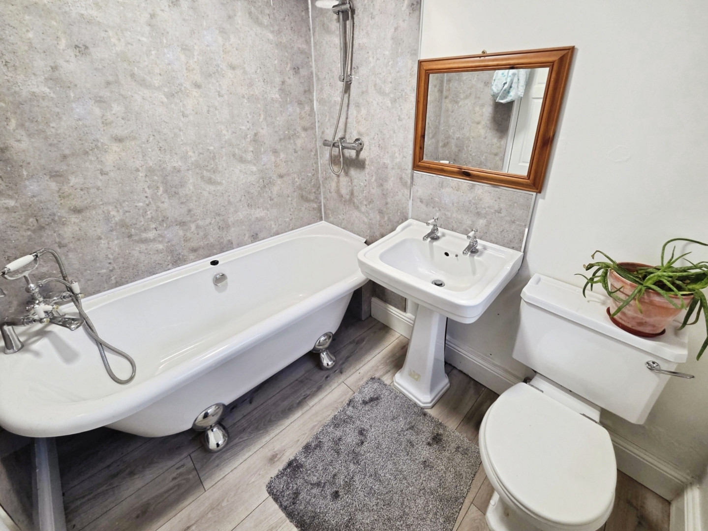Fitted with a free standing bath having hand held mixer over, wc, wash hand basin and central heating radiator.