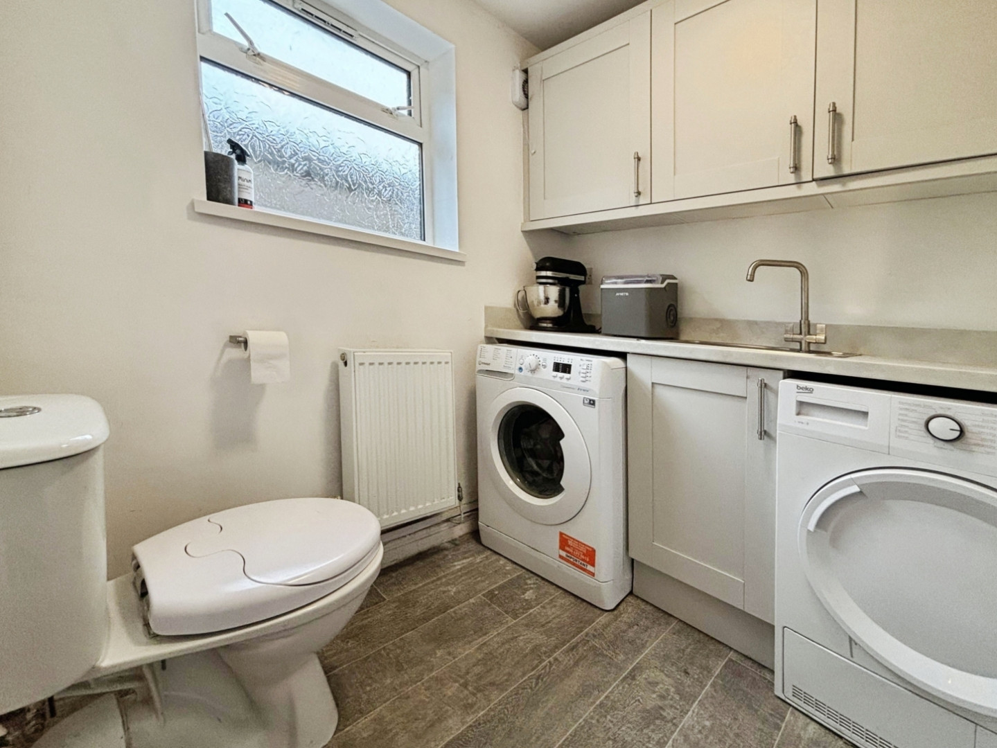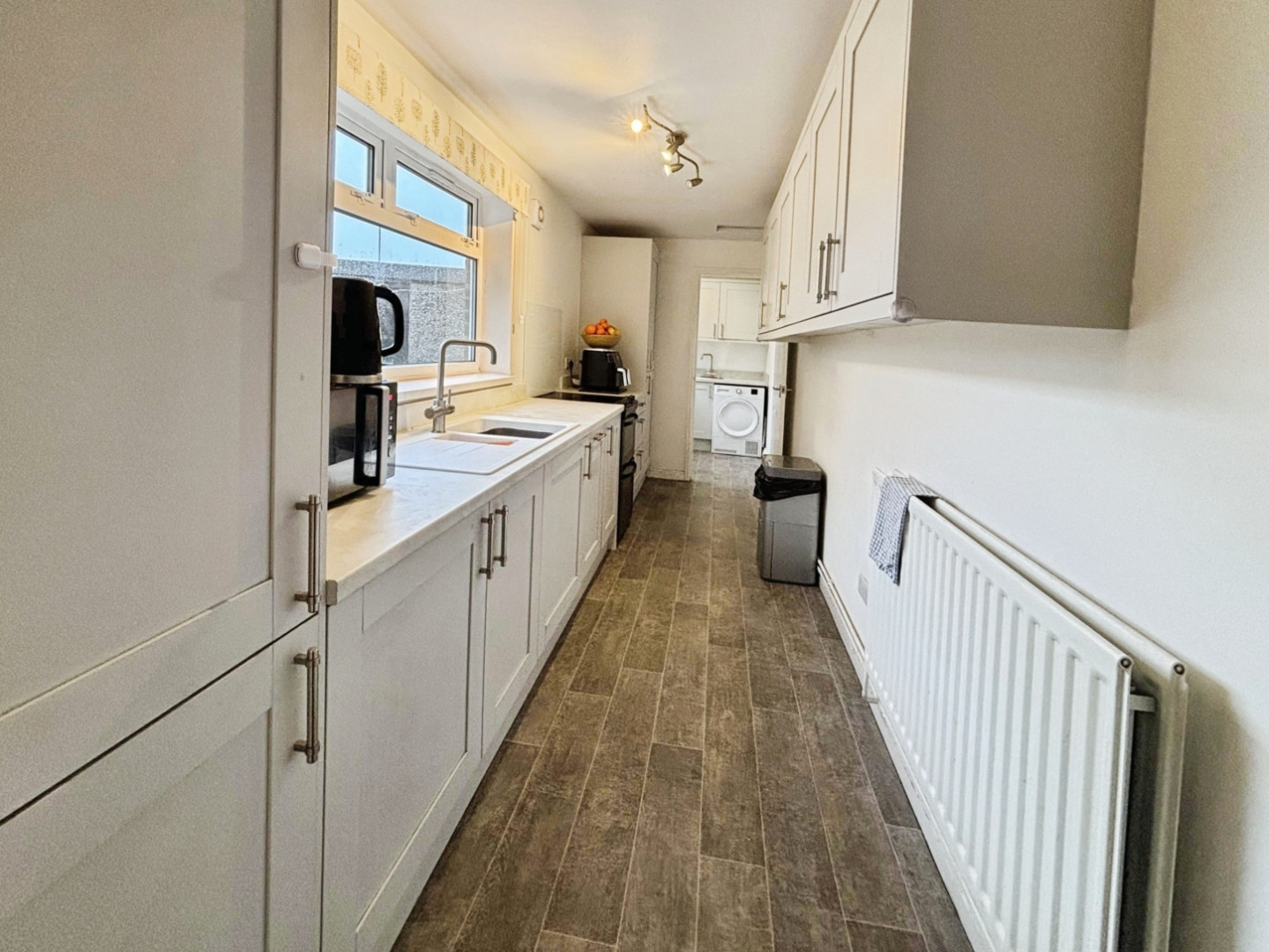 Fitted with wall and base units with counter top, plumbing for washing machine and space for tumble dryer, stainless steel sink unit with mixer tap, central heating radiator and upvc double glazed iwndow to rear.