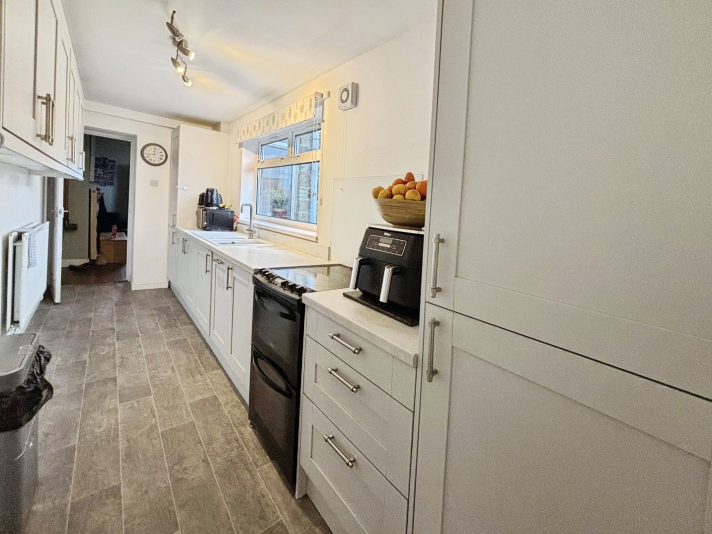 Fitted with wall and base units having contrasting work surfaces over, one and a half bowl sink unit with mixer tap, integrated slimline dishwasher, slot for electric oven, wall mounted gas boiler, double central heating radiator , extractor fan and upvc double glazed window to rear,