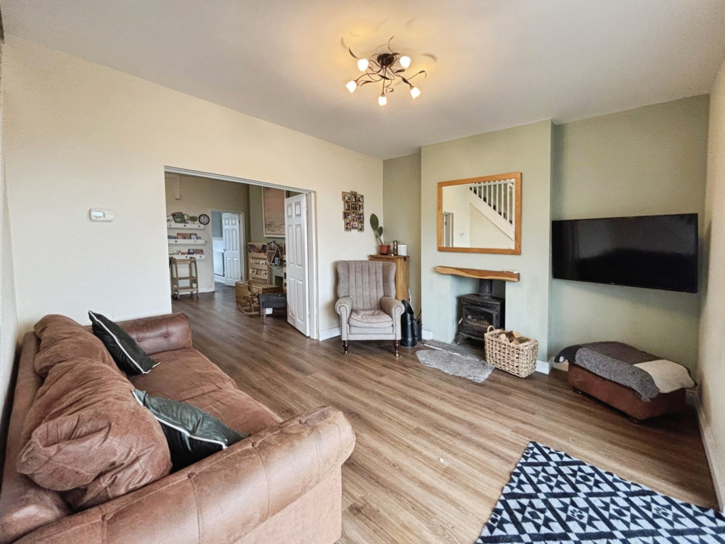 Inside, discover two spacious double bedrooms and a well-appointed bathroom featuring a convenient shower. The ground floor offers excellent entertaining space with two generous reception rooms, one of which is enhanced by a cosy multi-fuel burning stove , modern fitted kitchen and a ground floor cloaks wc/utility room.