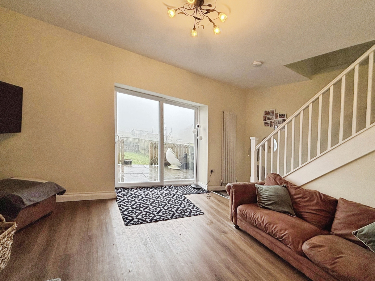 Having a feature inglenook fireplace housing multi burning stove, vertical radiator, open staircase to first floor and patio doors to front.
