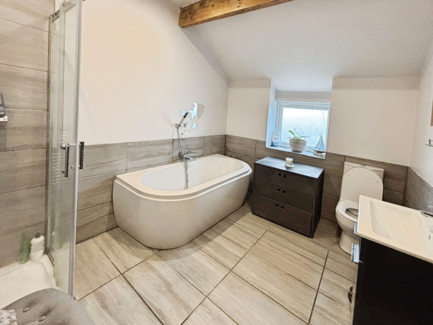 Having a panelled bath, corner shower unit , wc, wash hand basin, chrome heated towel rail, tiled flooring and upvc opaque window to rear.