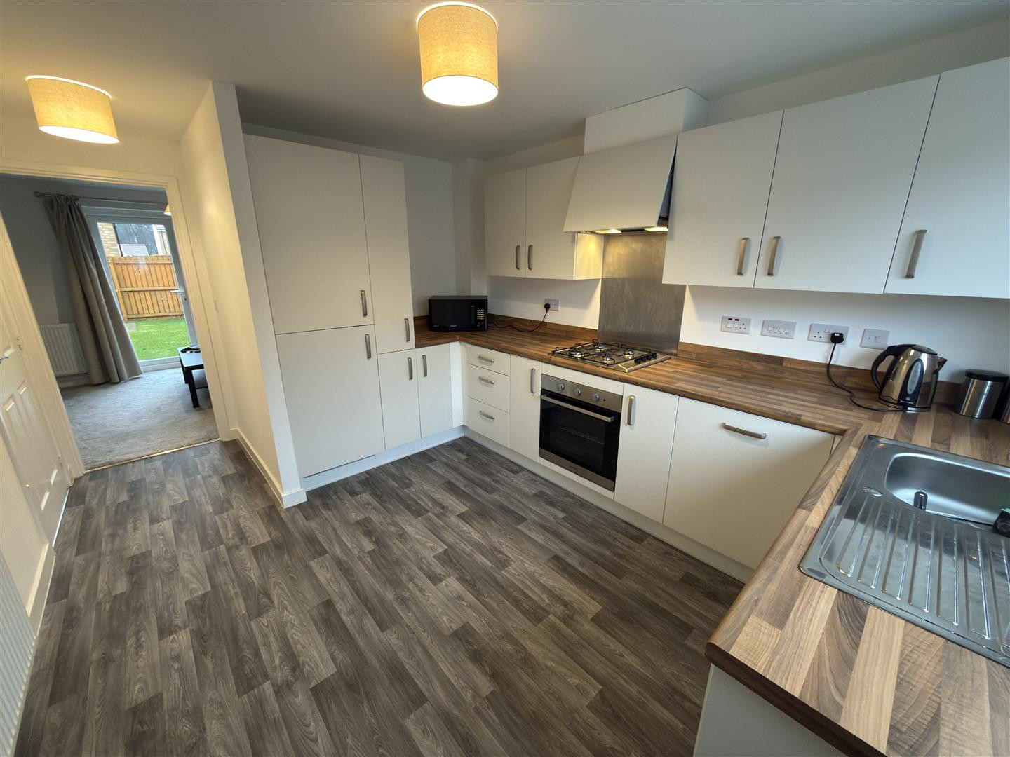 Upvc double glazed window to front, fitted with wall, base and drawer units, four ring gas hob with extractor over and oven, integrated fridge freezer, washing machine and dishwasher. Stainless steel sink and radiator.
