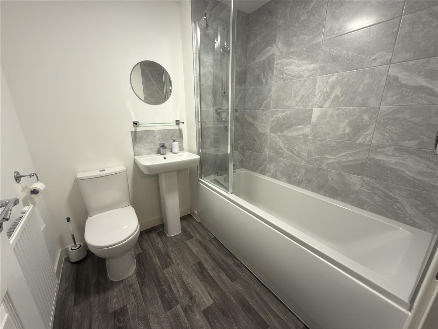 Bath with shower over and screen, w.c, wash hand basin and radiator.