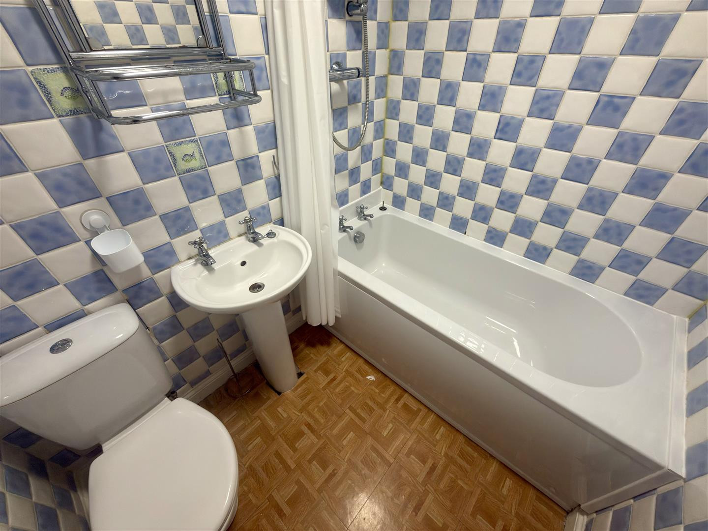 With a suite comprising panelled bath, pedestal wash hand basin and low level W,C. Fully tiled walls.