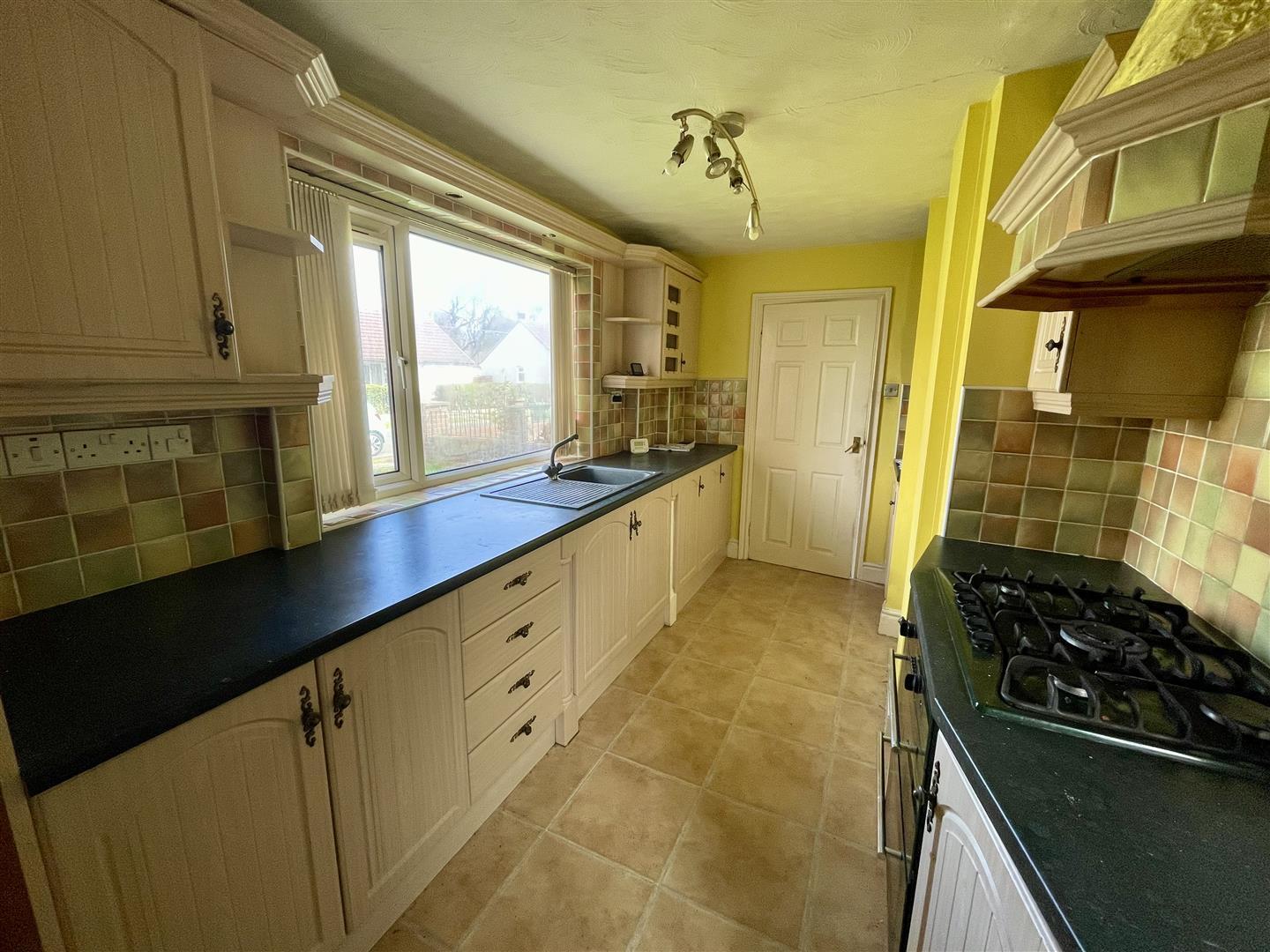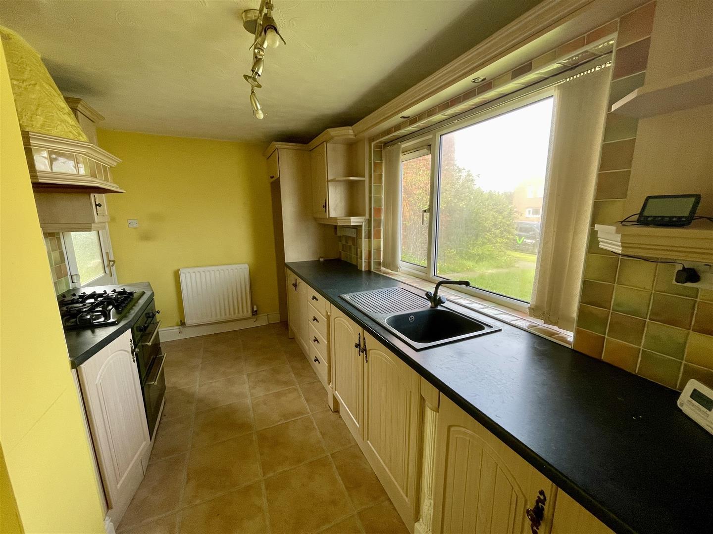 Fitted with wall, base and drawer units including display cabinets, with contrasting work surfaces. Composite sink with mixer tap, integrated five ring gas hob and electric oven with extractor over. Part tiled walls and laminate flooring.