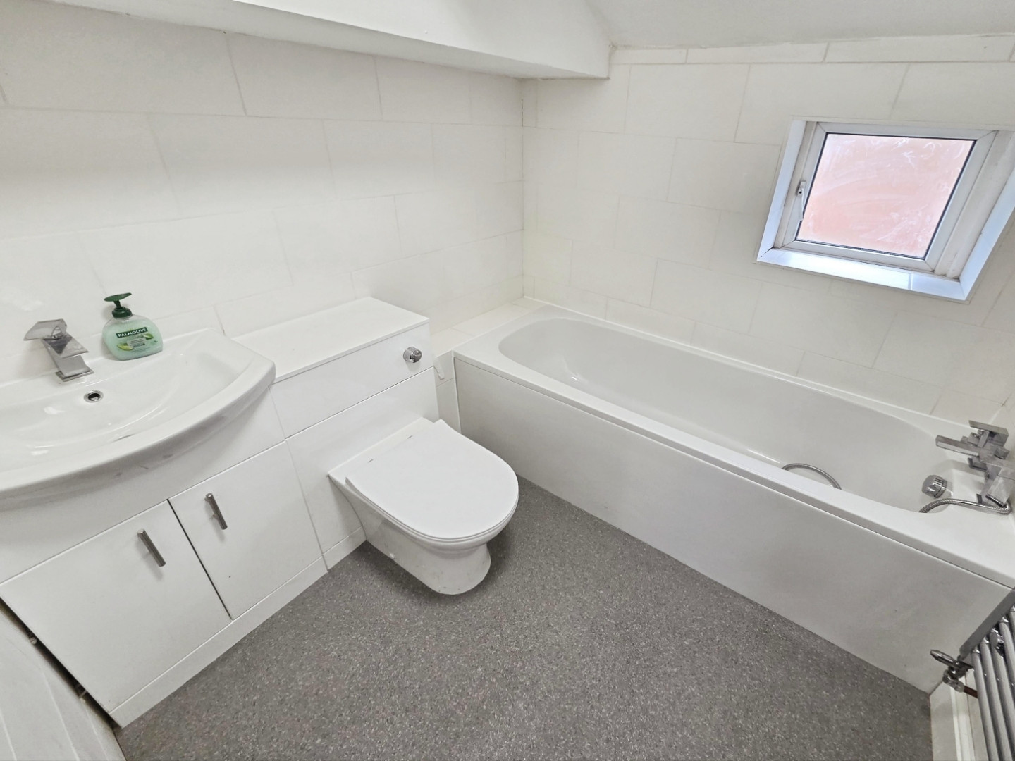 Fitted with a panelled bath having shower over, wc, wash hand basin set to vanity unit,