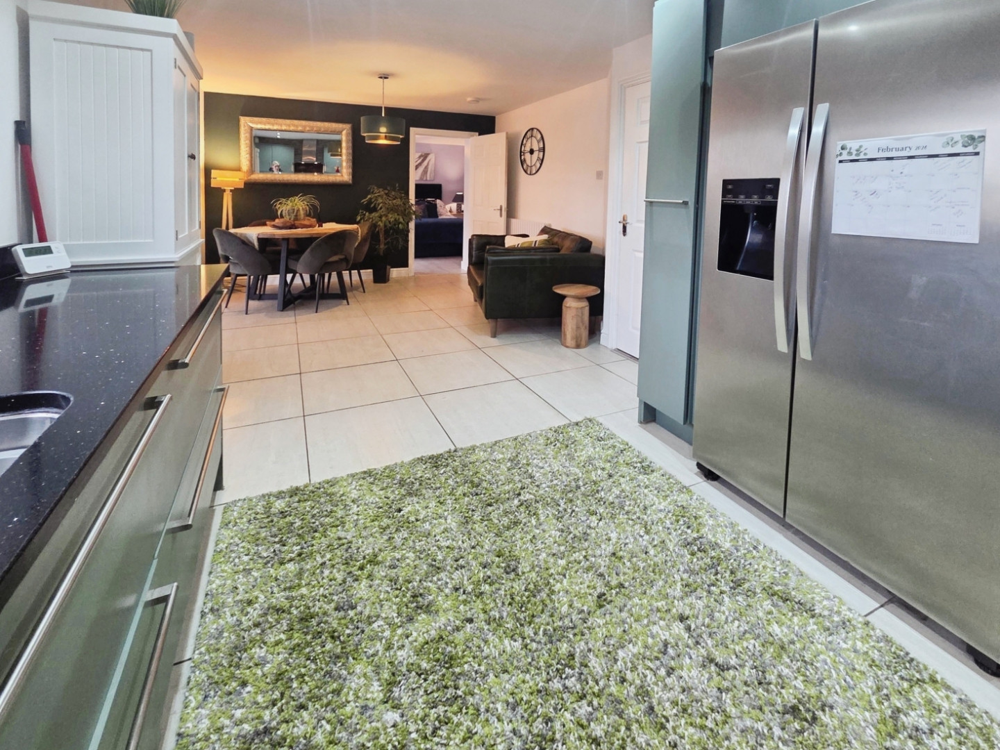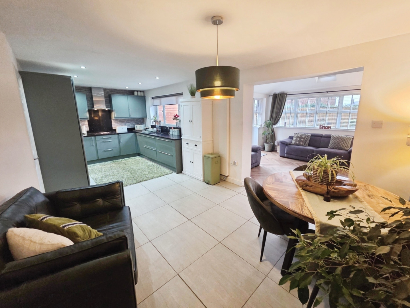 Extensively fitted kitchen with a range of wall and base units with granite work surfaces over and integrated sink unit with drainer, integrated appliances to include eye level electric oven and separate touch hob with extraction chimney over, dishwasher and space for fridge freezer, tiled flooring, upvc window to rear. To the dining end is tiled flooring, central heating radiator and opening to garden room.
