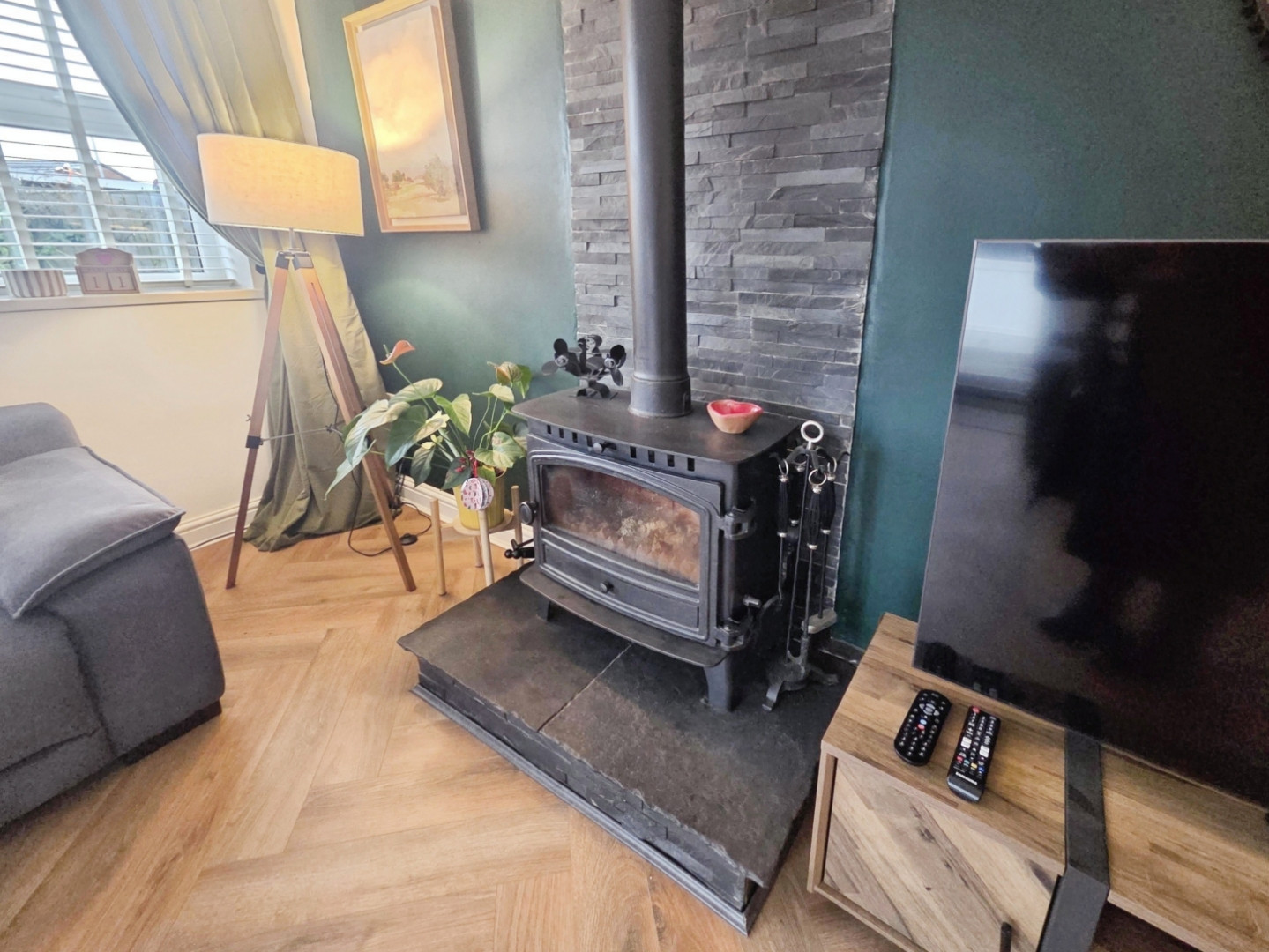 Having laminate flooring, feature log burning stove, patio doors to rear garden, velux windows.