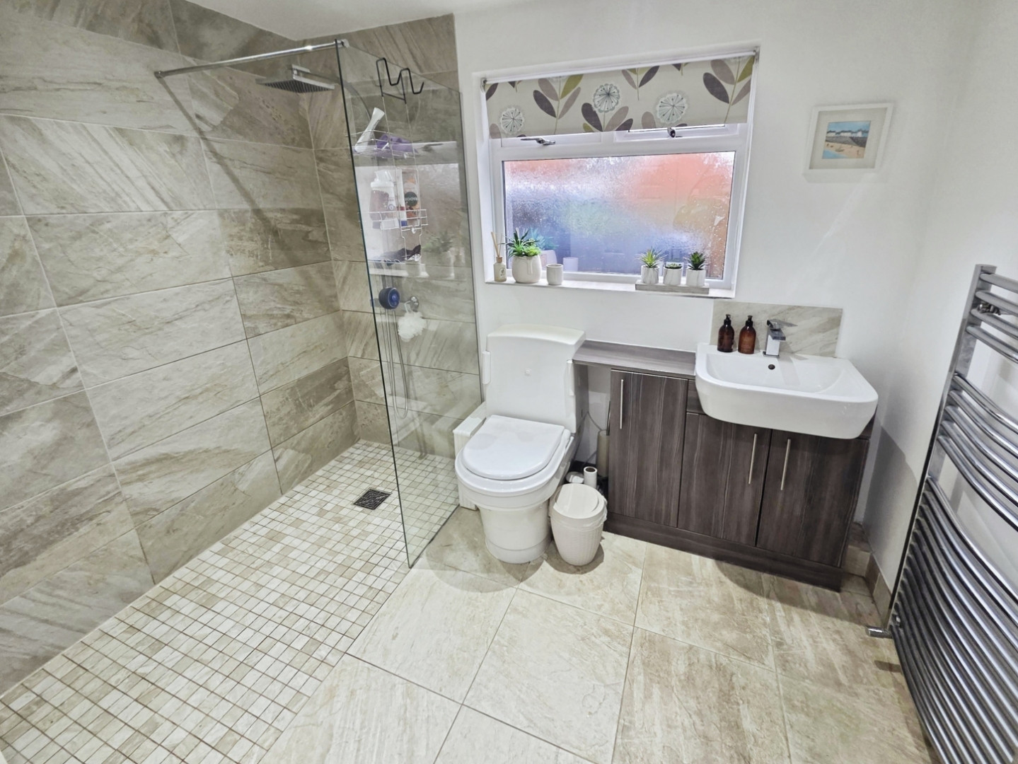 Fitted with a modern suite comprising of walk in shower cubicle fully tiled, wash hand basin and wc set to vanity unit and chrome heated towel rail.