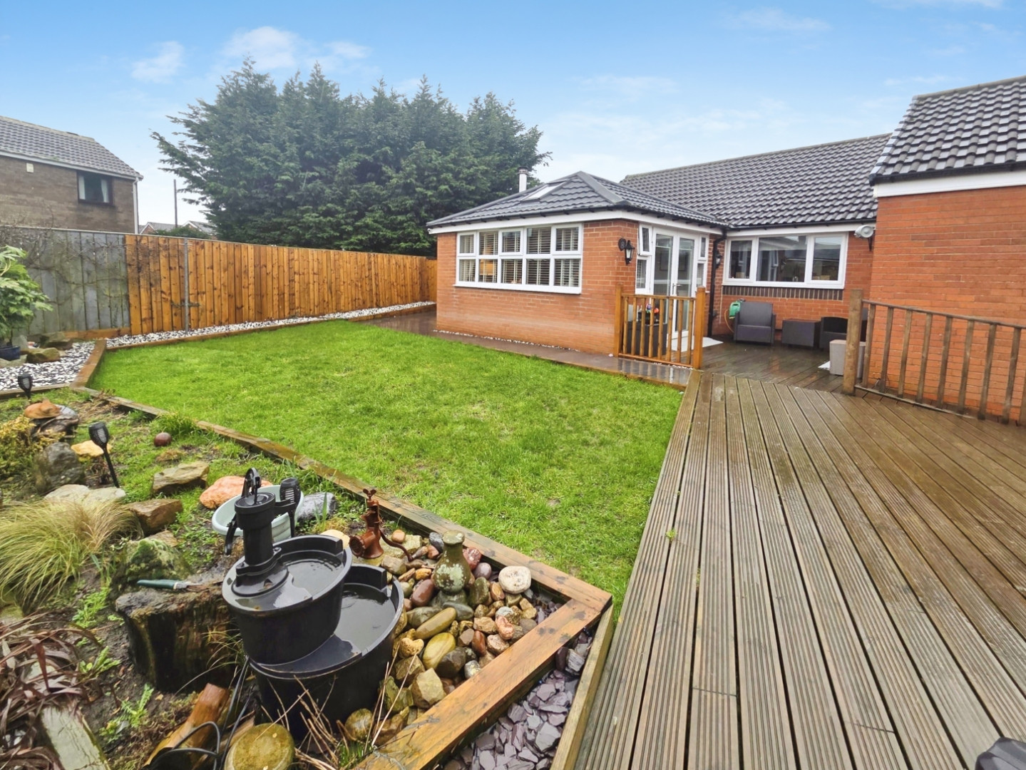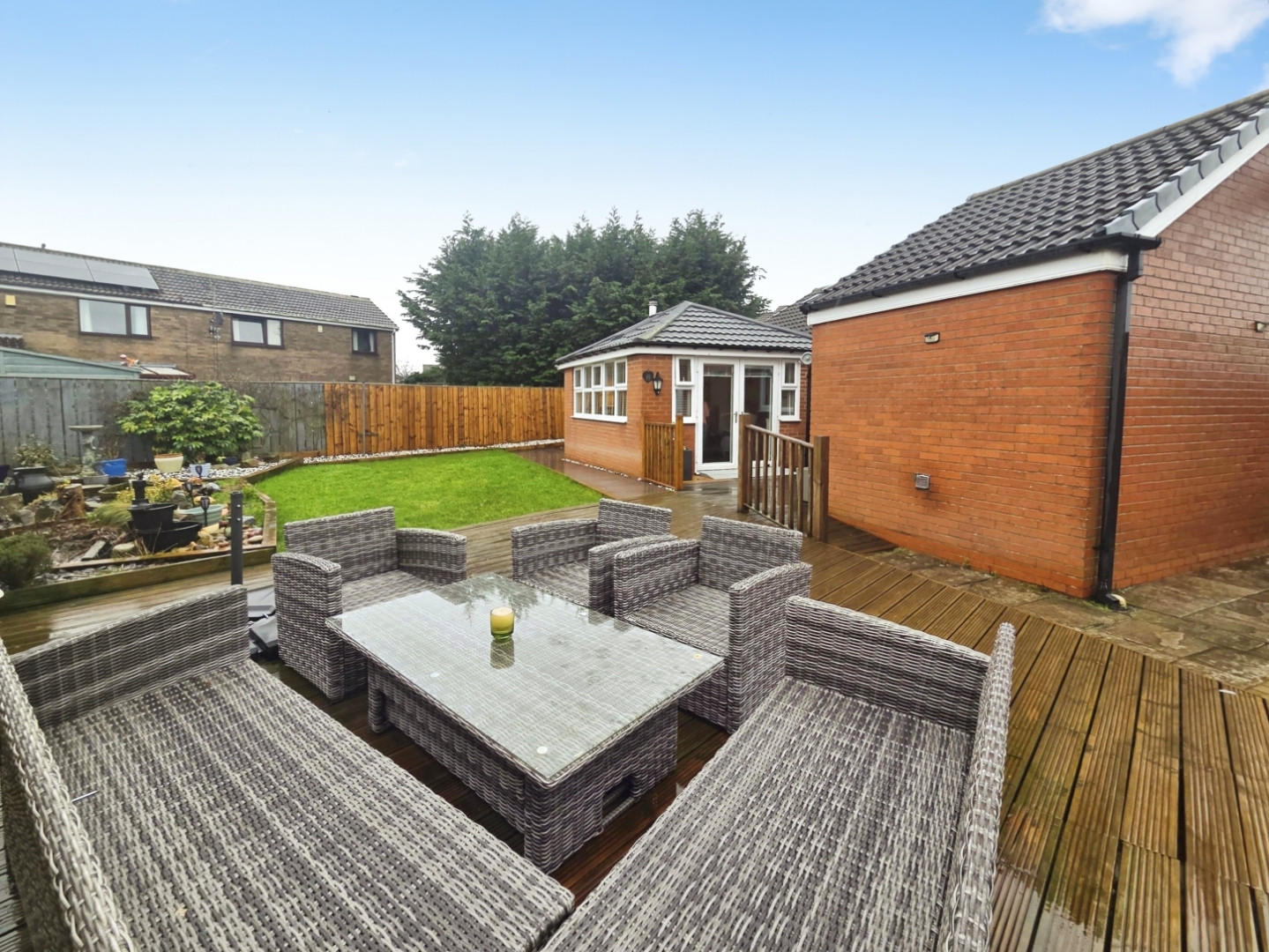 To the rear is a good sized wrap around landscaped garden Having patio area, lawn, Decking area, and double gates to the side.