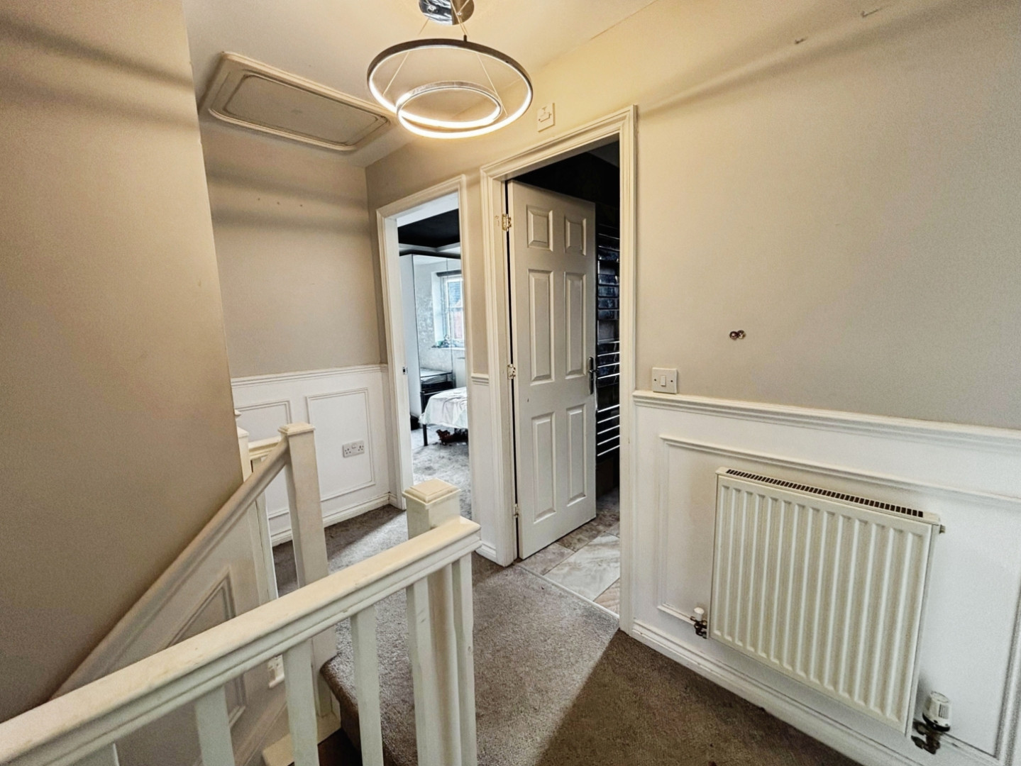 Spindle balustrade, central heating radiator, storage cupboard and loft access