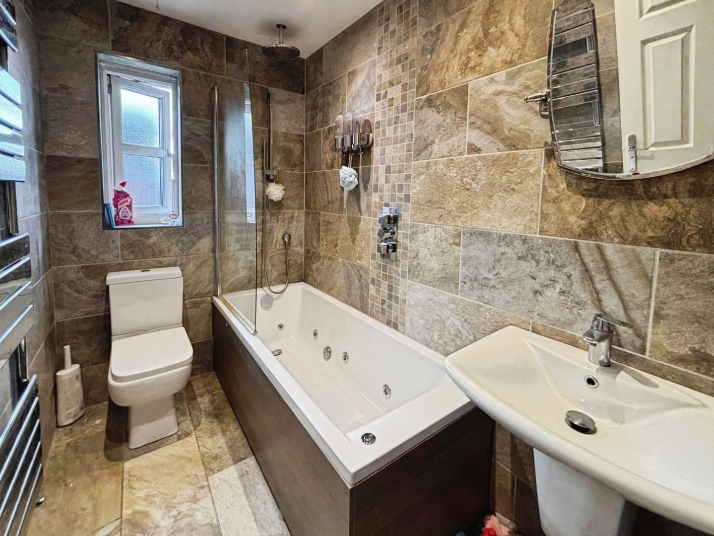 Fitted with a White Suite including jet panelled bath, shower screen, mains waterfall shower, wc, pedestal wash hand basin, tiled walls, tiled floor, spot lighting and chrome heated towel rail