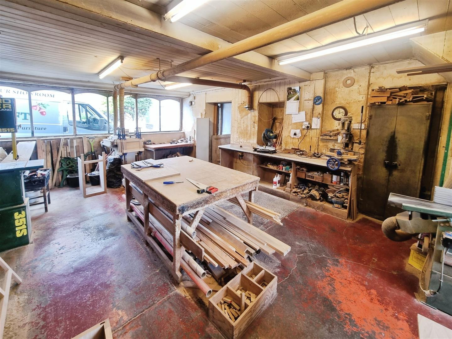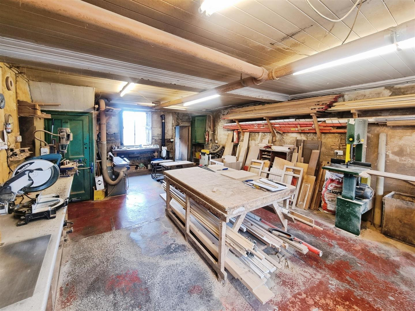 Currently used as the main workshop with concrete floor and work benches.