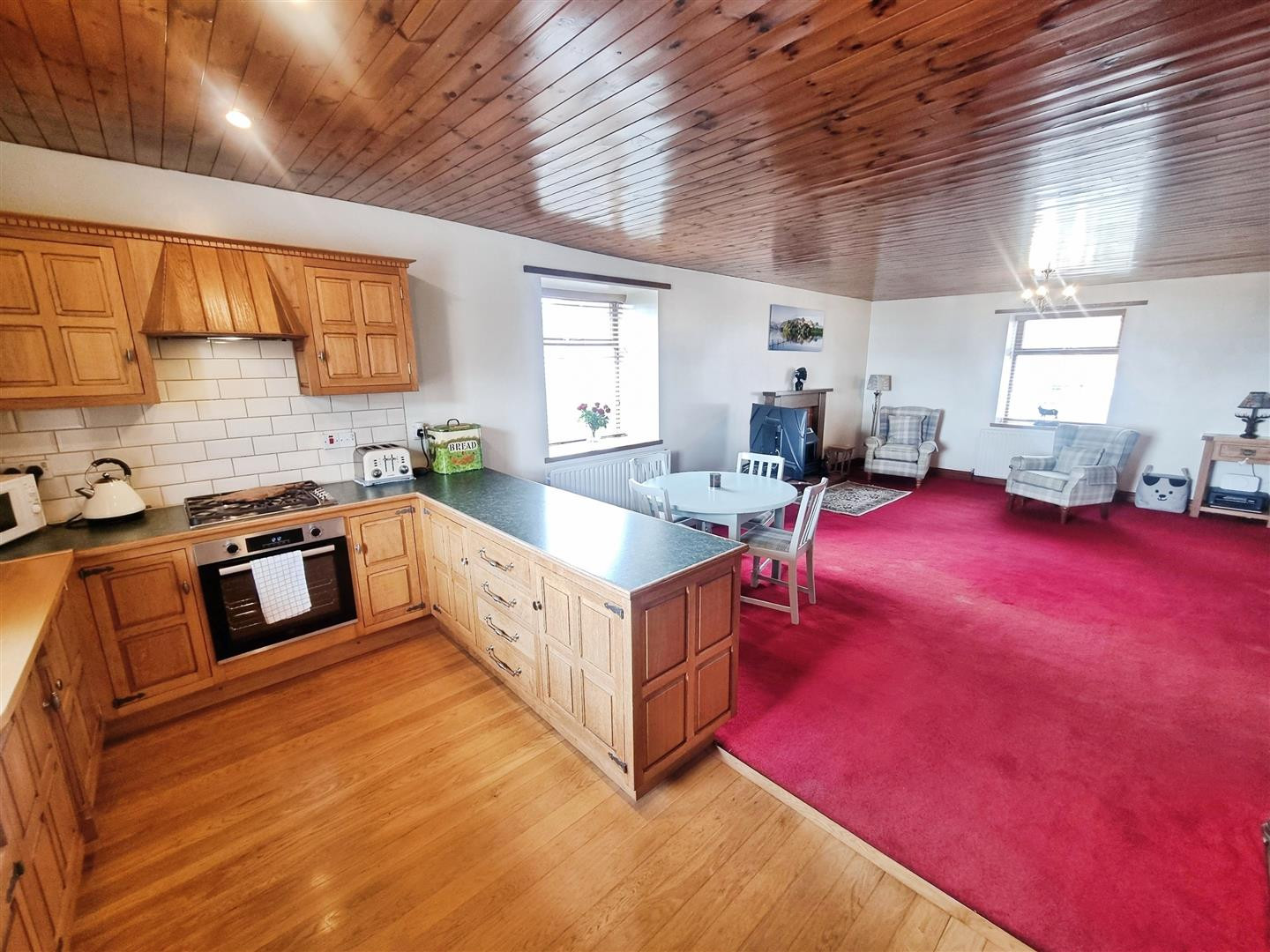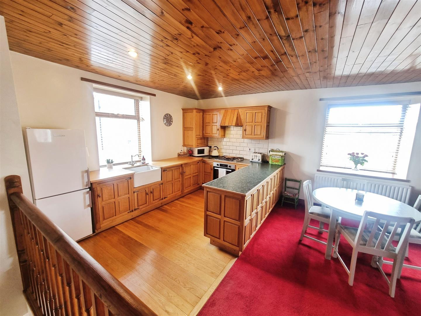 Kitchen is fitted with wall and base units with contrasting work surfaces over, Belfast sink unit with mixer tap, integrated electric oven and gas hob.