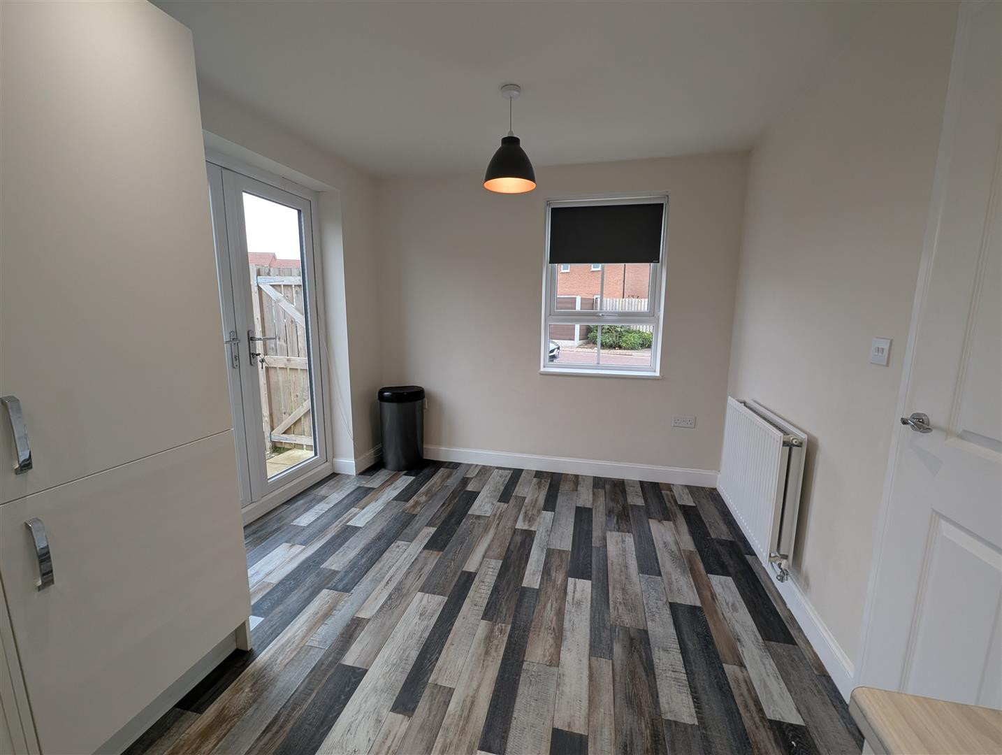 Upvc double glazed window to front and window and double doors to side, fitted with white gloss wall, base and drawer units, stainless steel sink with mixer tap, integrated hob with extractor over and splashback. Integrated oven and fridge freezer with space for a washing machine and spotlights to ceiling, To the dinning area there is ample space for a table and chairs and radiator.