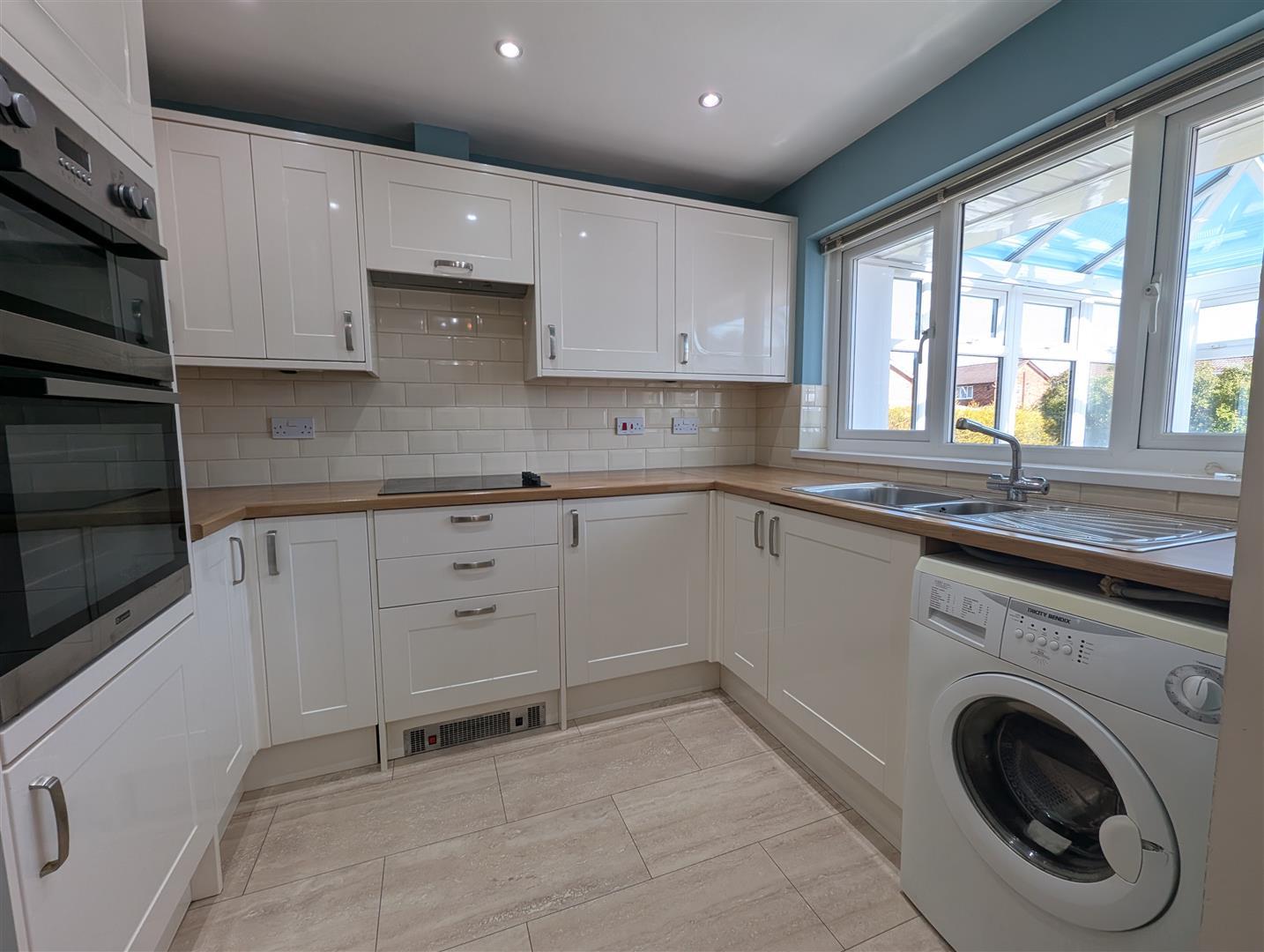 Upvc double glazed window to rear, fitted with cream wall, base and drawer units, one and a half bowl stainless steel sink with mixer taps, four ring integrated electric hob with extractor over and eye level double oven. Space for a fridge freezer and washing machine. Part tiled New York style tiled walls and spotlights to ceiling.