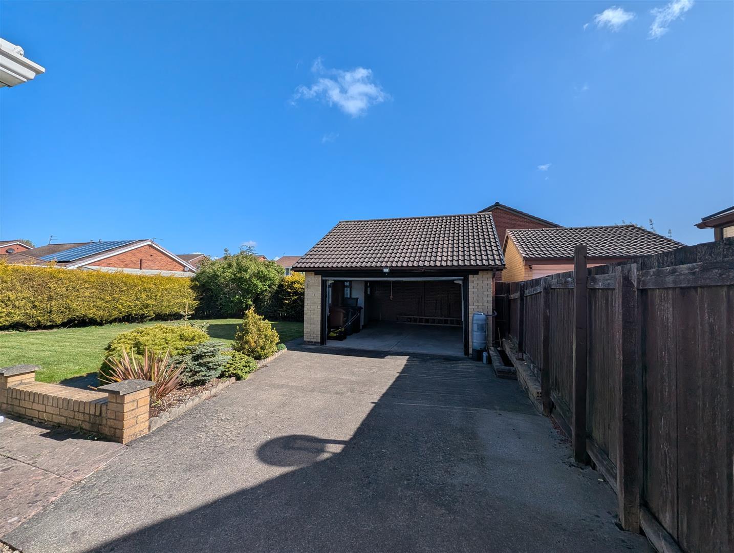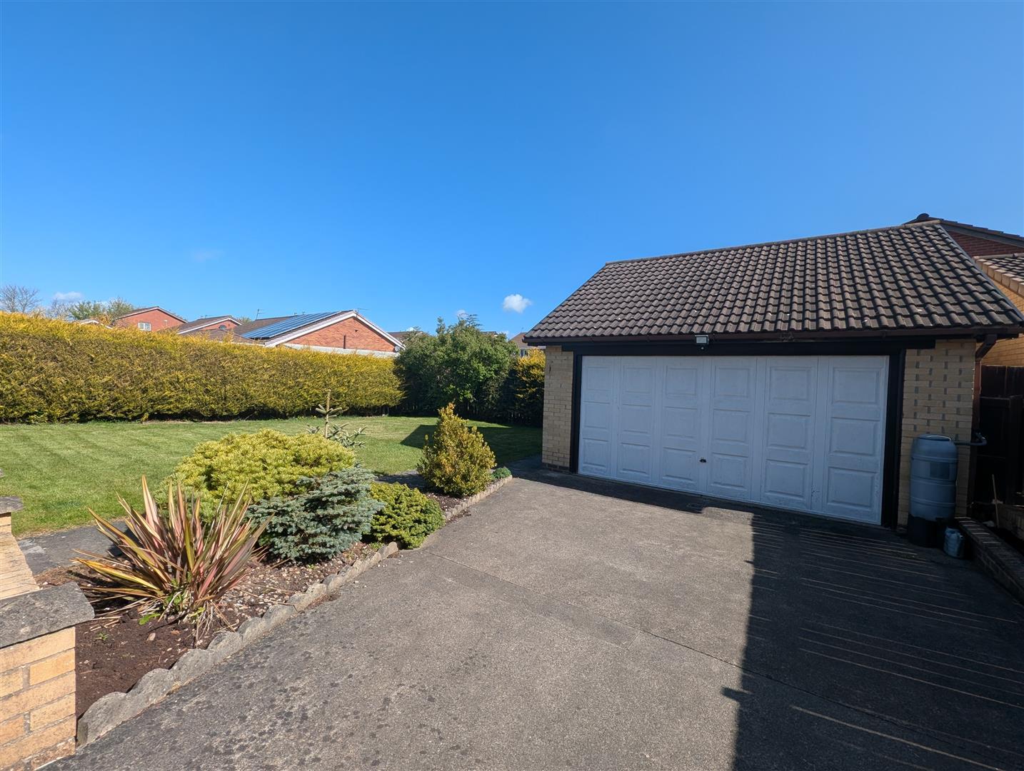 To the front there is a generous driveway giving access to a well maintained garden area which is mainly laid to lawn and double gated access to the rear of the property where you will find the detached garage.