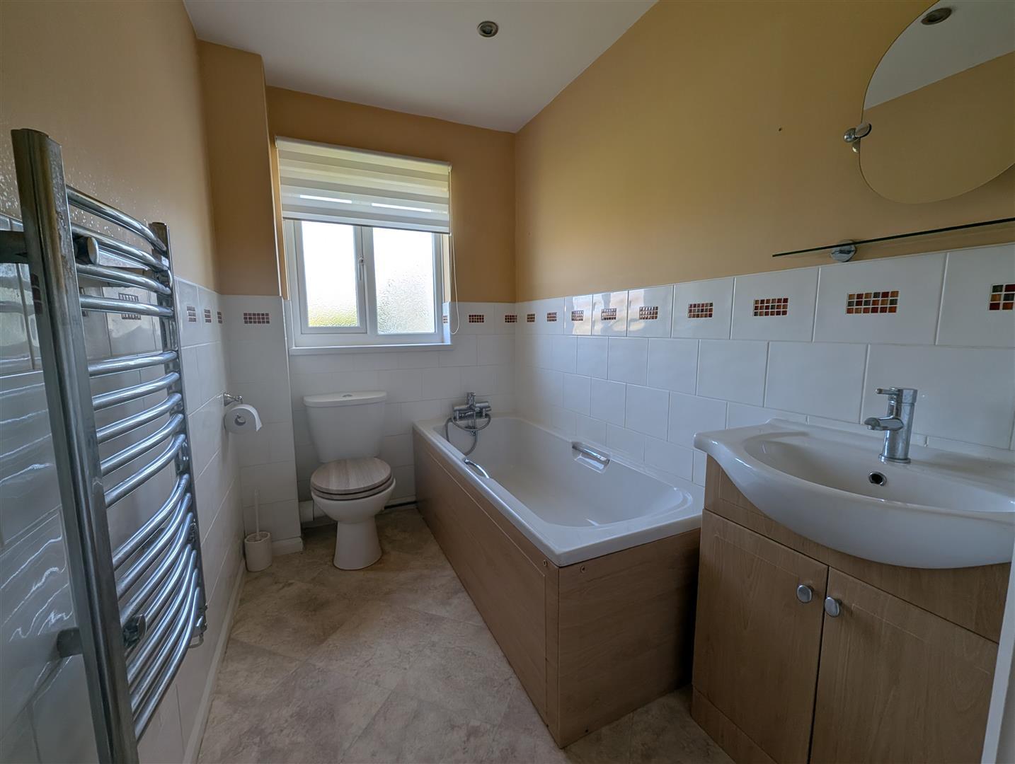 Upvc double glazed obscure window to rear, panelled bath with mixer tap and spray, Wash hand basin in vanity, low level w.c, part tiled walls and heated towel rail.