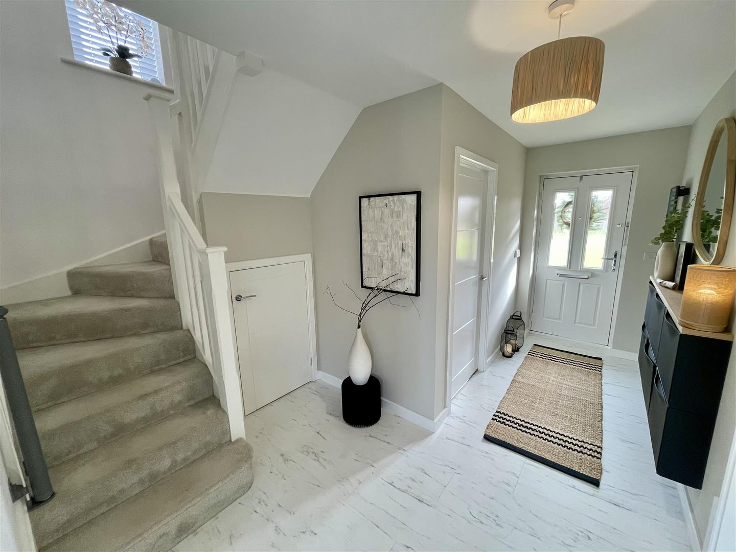 Composite door to front, staircase to first floor landing with storage cupboard under and vertical radiator. A welcoming, bright and airy space.