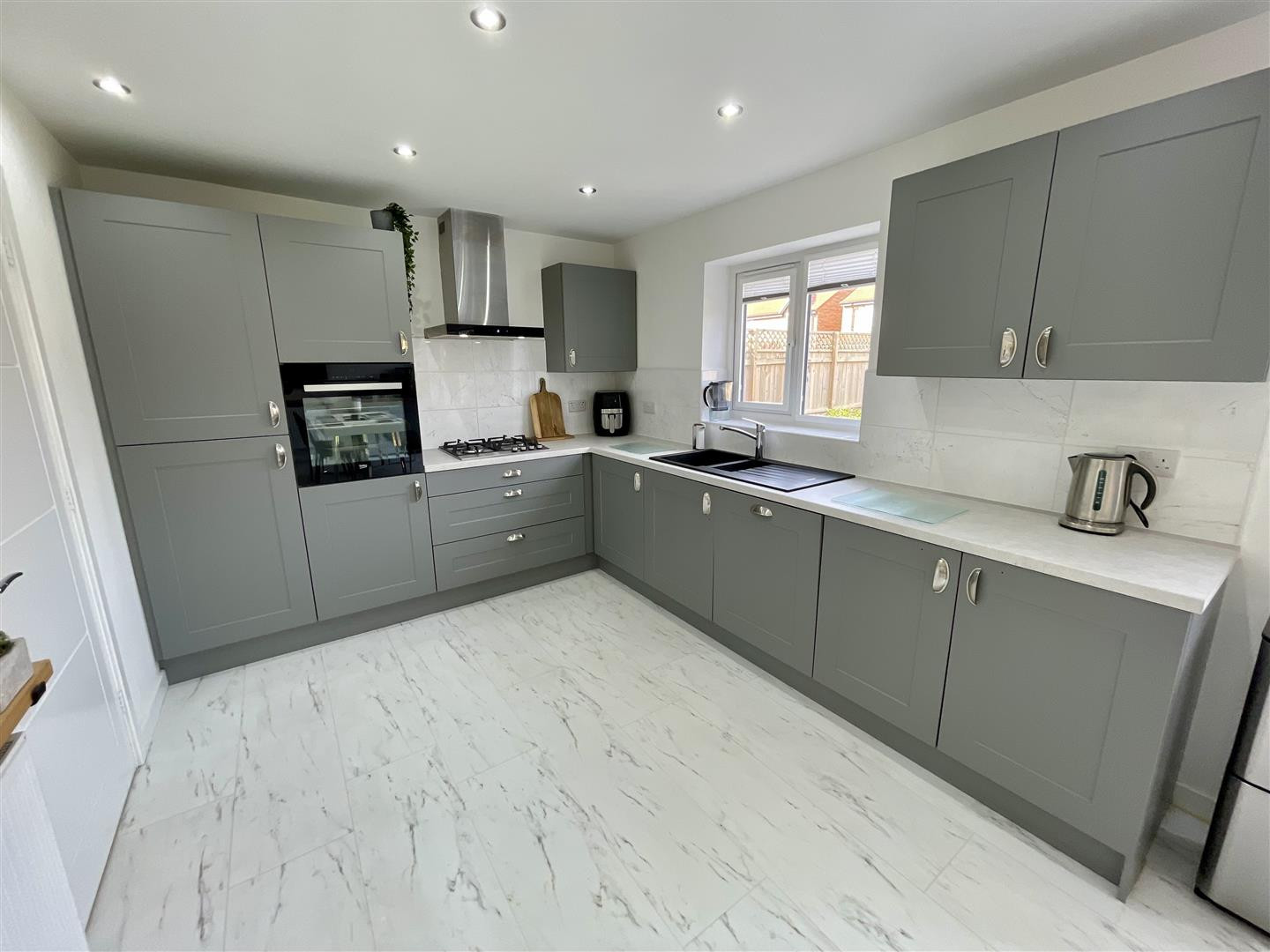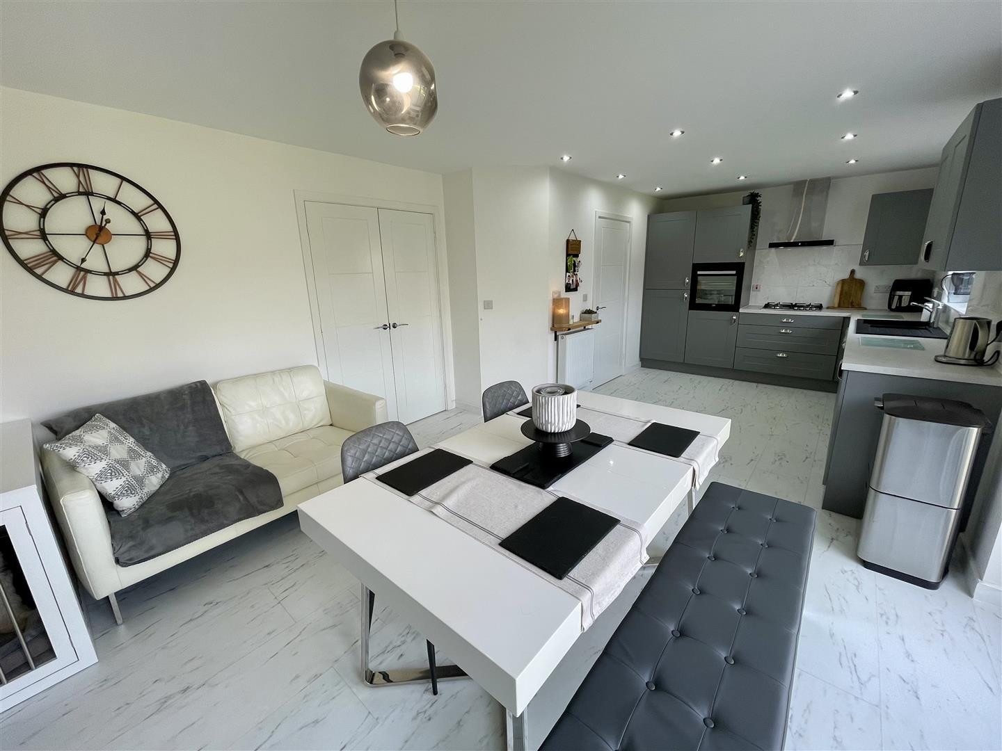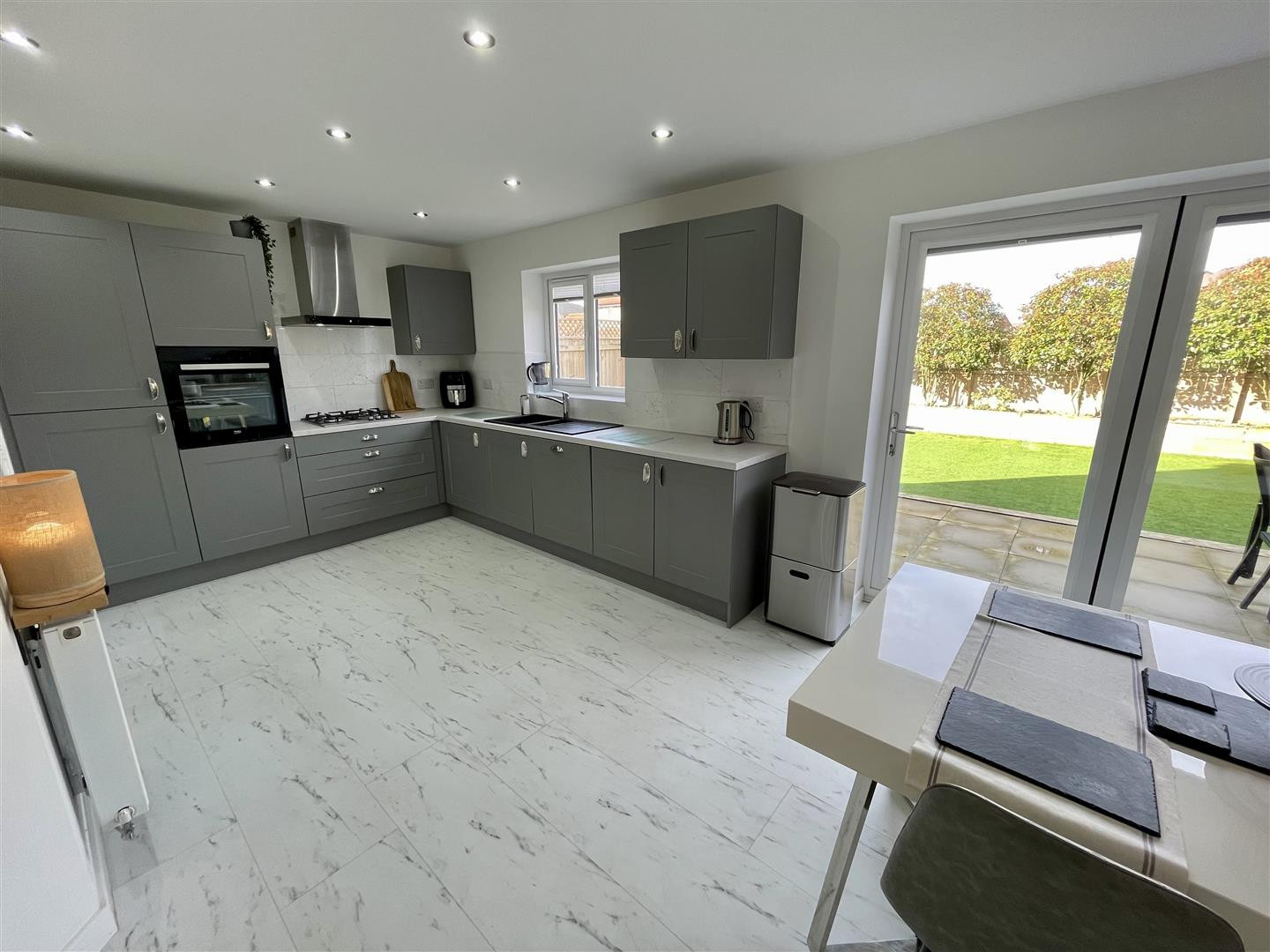 Upvc double glazed window to rear, fitted wall, base and drawer units with contrasting worktops. Composite sink with mixer tap, four ring gas hob with extractor over and eye level oven. Integrated fridge freezer and dishwasher, bi-fold doors to rear, spotlights to ceiling and radiator. Ample space for a dining table and chairs.