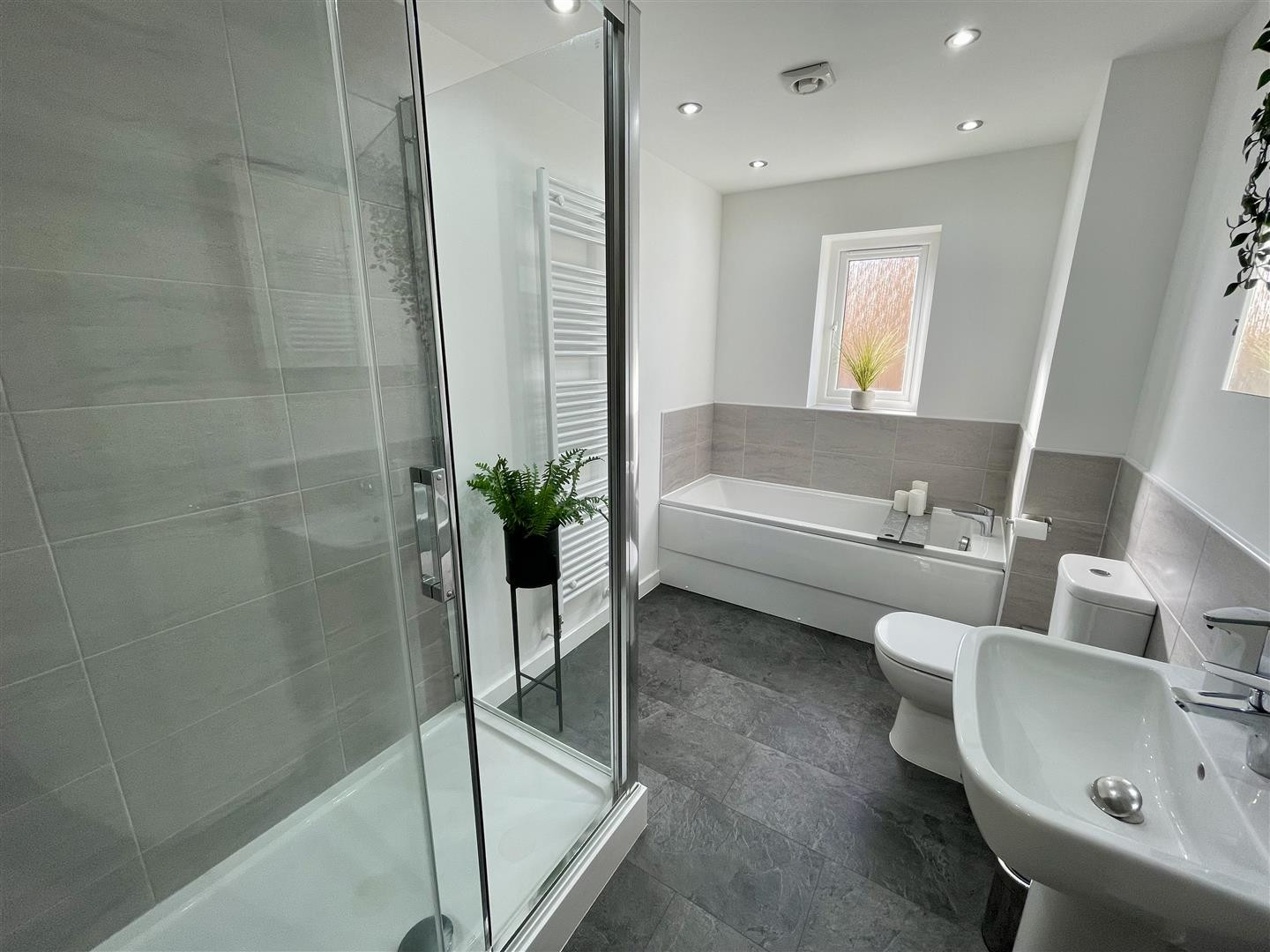 Upvc double glazed obscure window to side, bath with mixer tap, walk in shower cubicle, low level w.c, wash hand basin, heated towel rail and spotlights to ceiling.