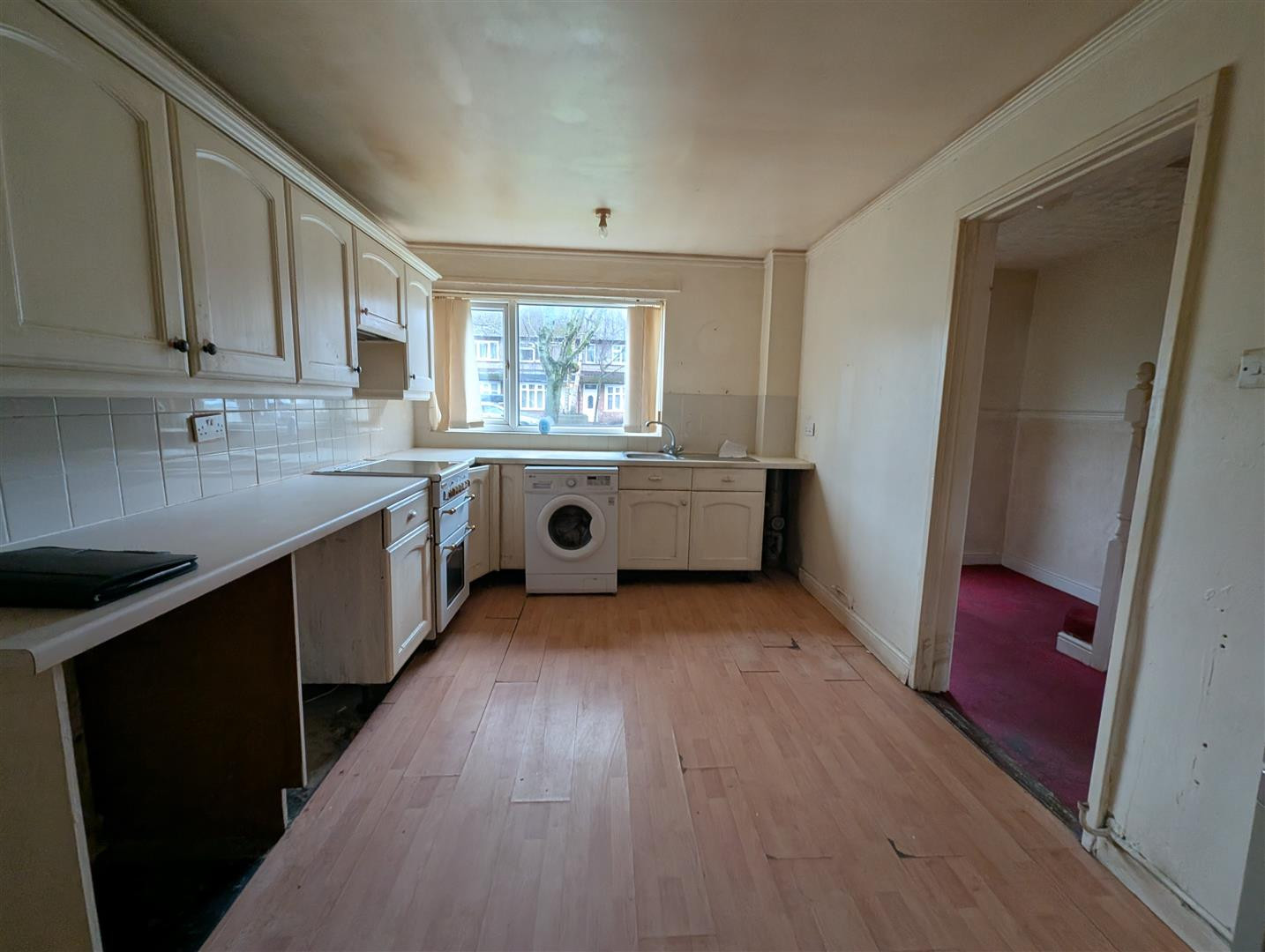 Upvc double glazed window to front, fitted with wall, base and drawer units, stainless steel sink with mixer tap, space for a cooker, fridge freezer and washing machine.