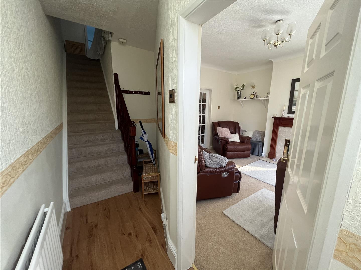 A UPVC double glazed entrance door, stairs to first floor, wood effect laminate flooring and central heating radiator.