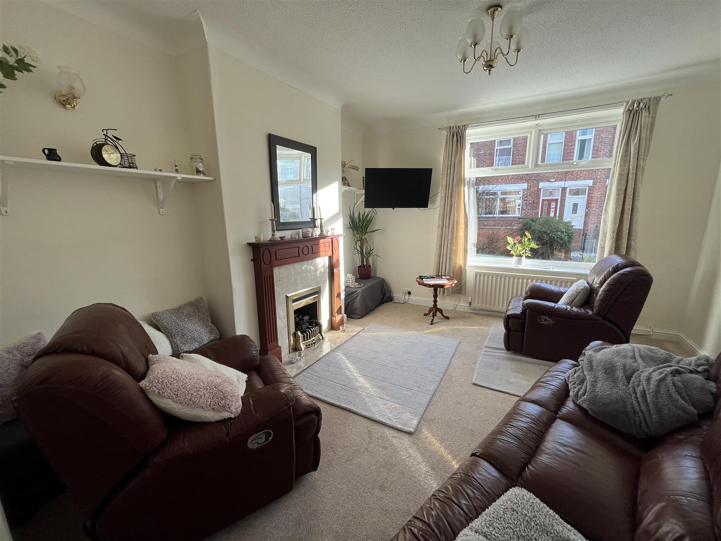 With feature fireplace having marble hearth and back housing inset gas fire with wooden surround, central heating radiator and UPVC double glazed window to front.