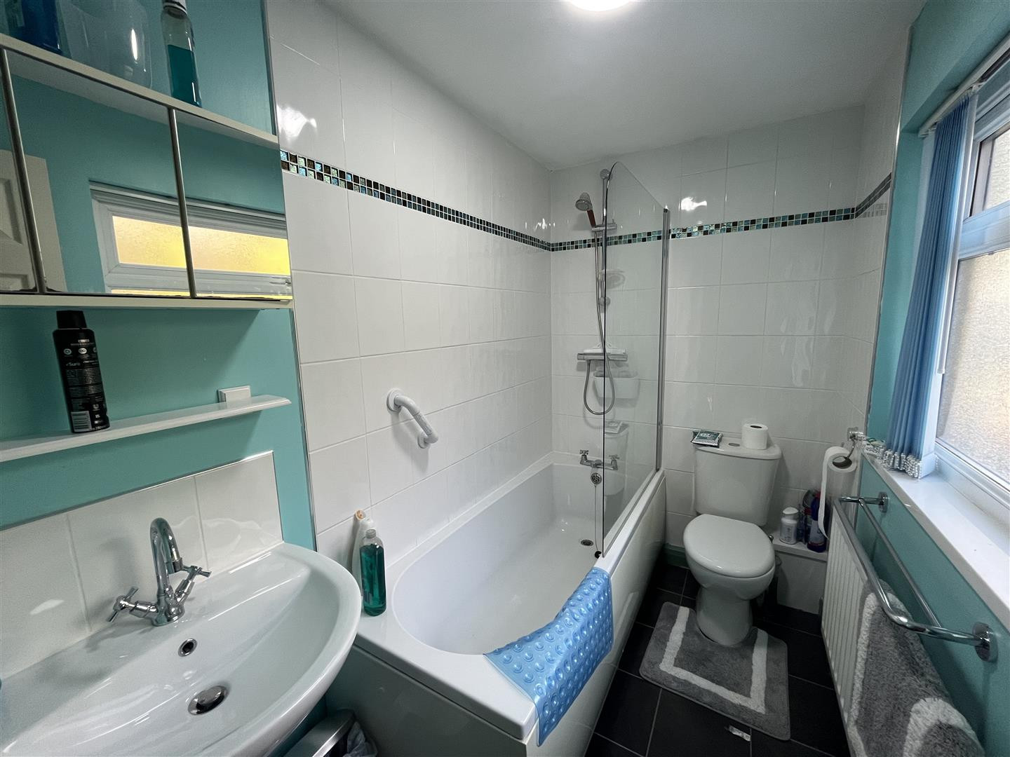 Bathroom is fitted with a white suite having panelled bath having electric shower over, WC, wash hand basin, tiled flooring, central heating radiator and obscured UPVC double glazed window to side.