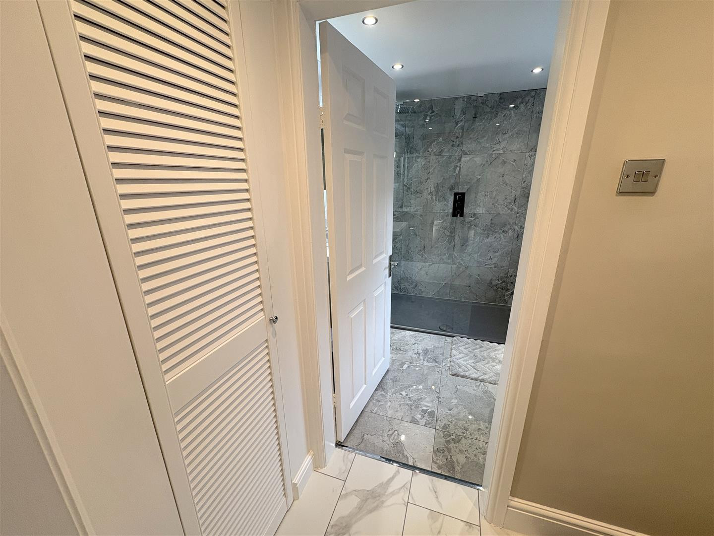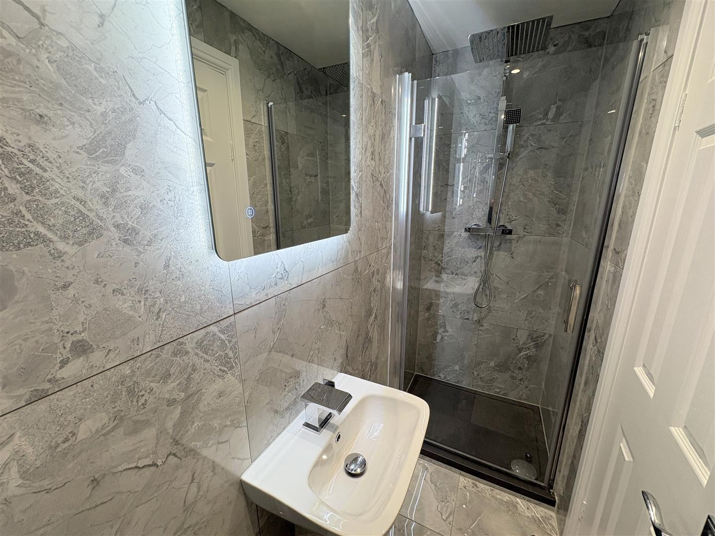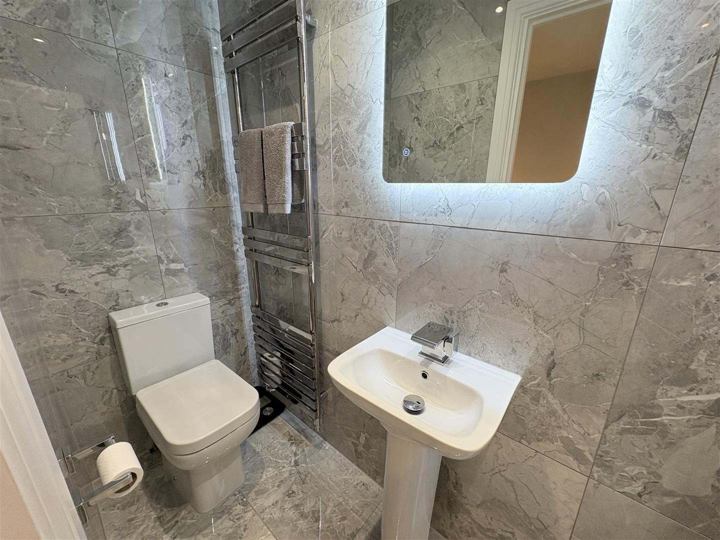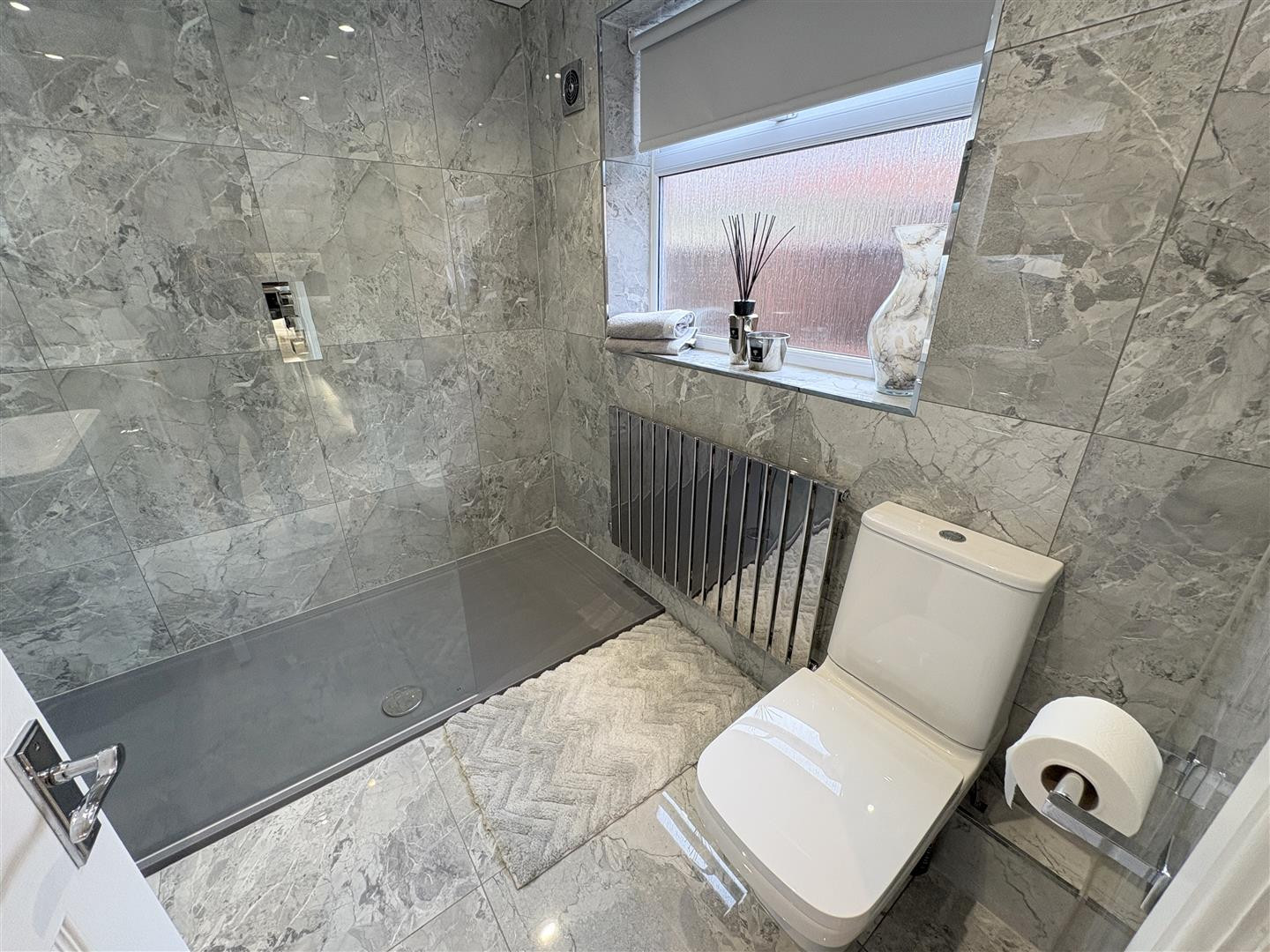 The downstairs bathroom has been refurbished to a high standard, featuring a double walk-in shower, a wash hand basin set within a vanity unit, a low-level WC, fully tiled walls, a double-glazed window, and a radiator.