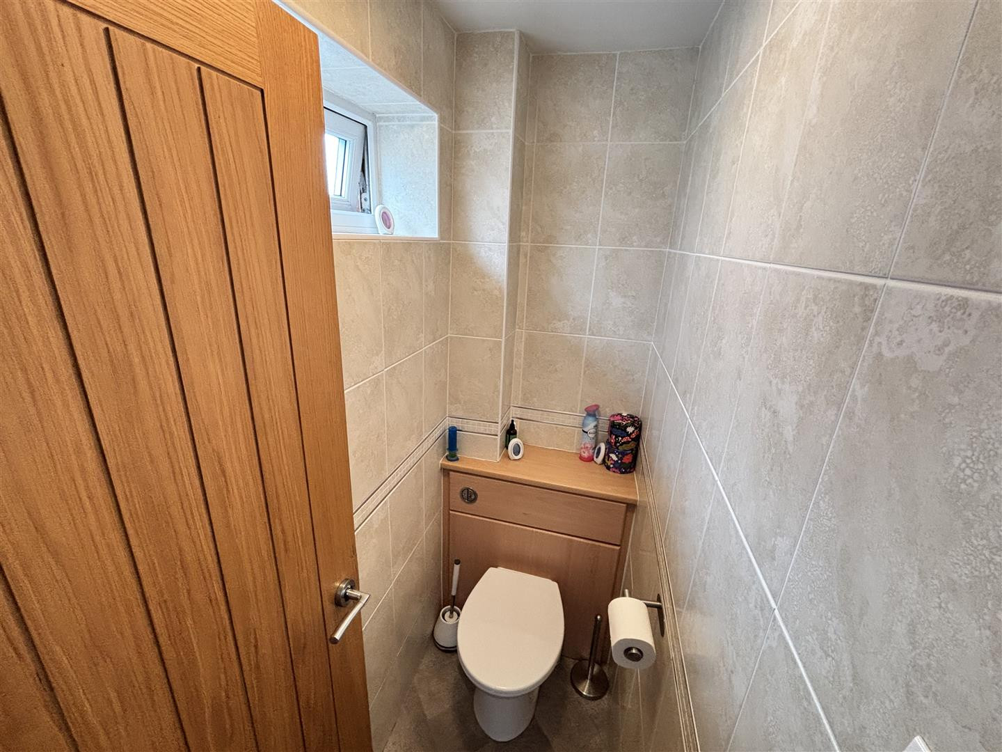 Comprising of a low level WC and UPVC double glazed opaque window to the side.