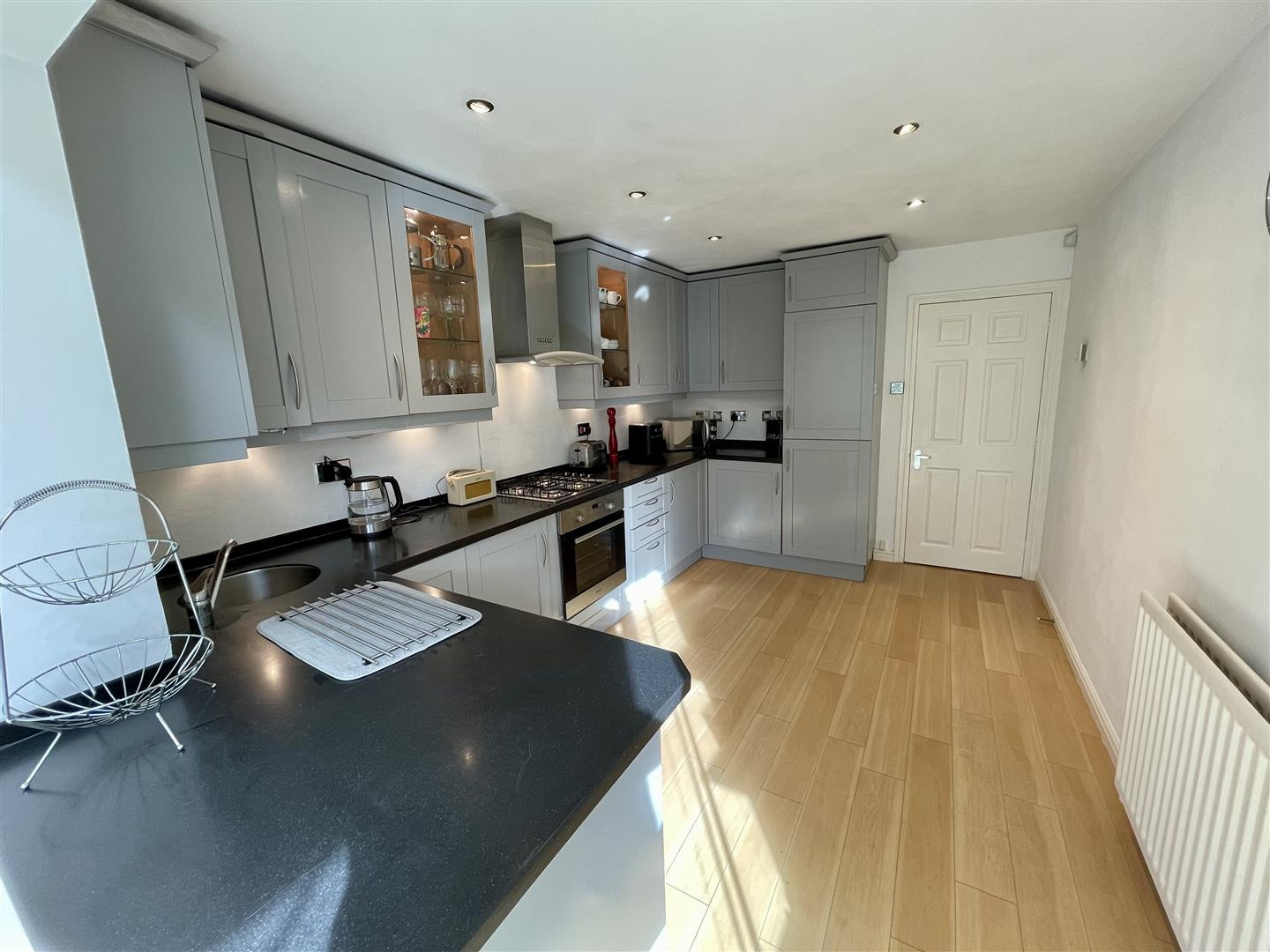 Fitted with a range of wall, base and drawer units including display cabinets, with contrasting work surfaces. Integrated stainless steel, bowl style sink with mixer tap. Gas hob and oven with extractor over. Integrated fridge freezer and dishwasher. Spotlights to ceiling, laminate flooring and radiator. Open plan to garden room.