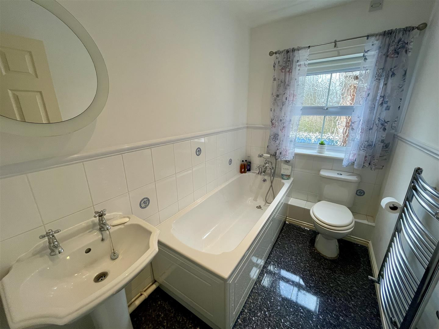 Upvc double glazed obscure window to side, bath with shower attachment, low level w.c, wash hand basin, extractor fan, part tiled walls, and heated towel rail.
