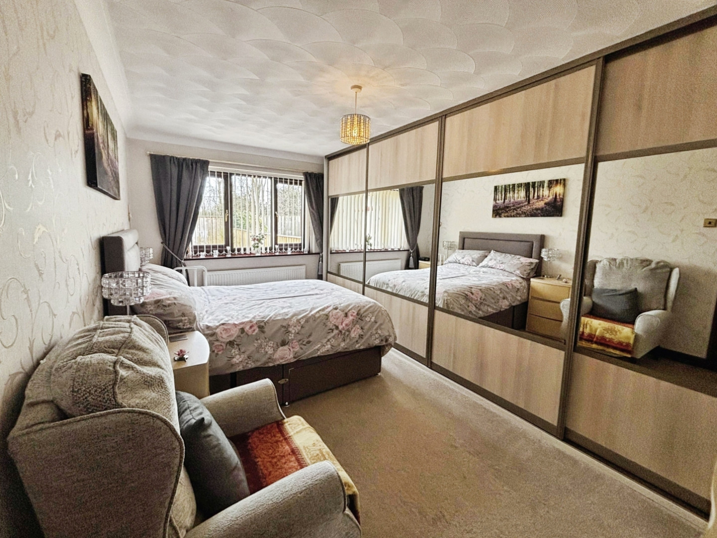 With sliding wardrobes, central heating radiator and sliding patio doors to garden room.