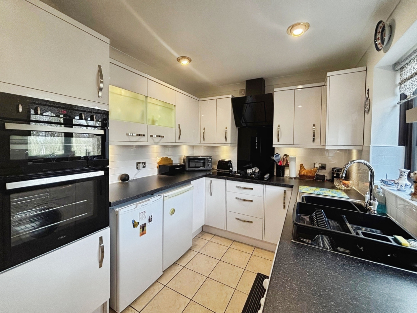 Fitted with a good range of wall and base units with contrasting work surfaces over, integrated double oven and a separate gas hob, plumbing for washing machine, space for under counter fridge freezer, central heating radiator, tiled flooring and upvc double glazed window and door to side.