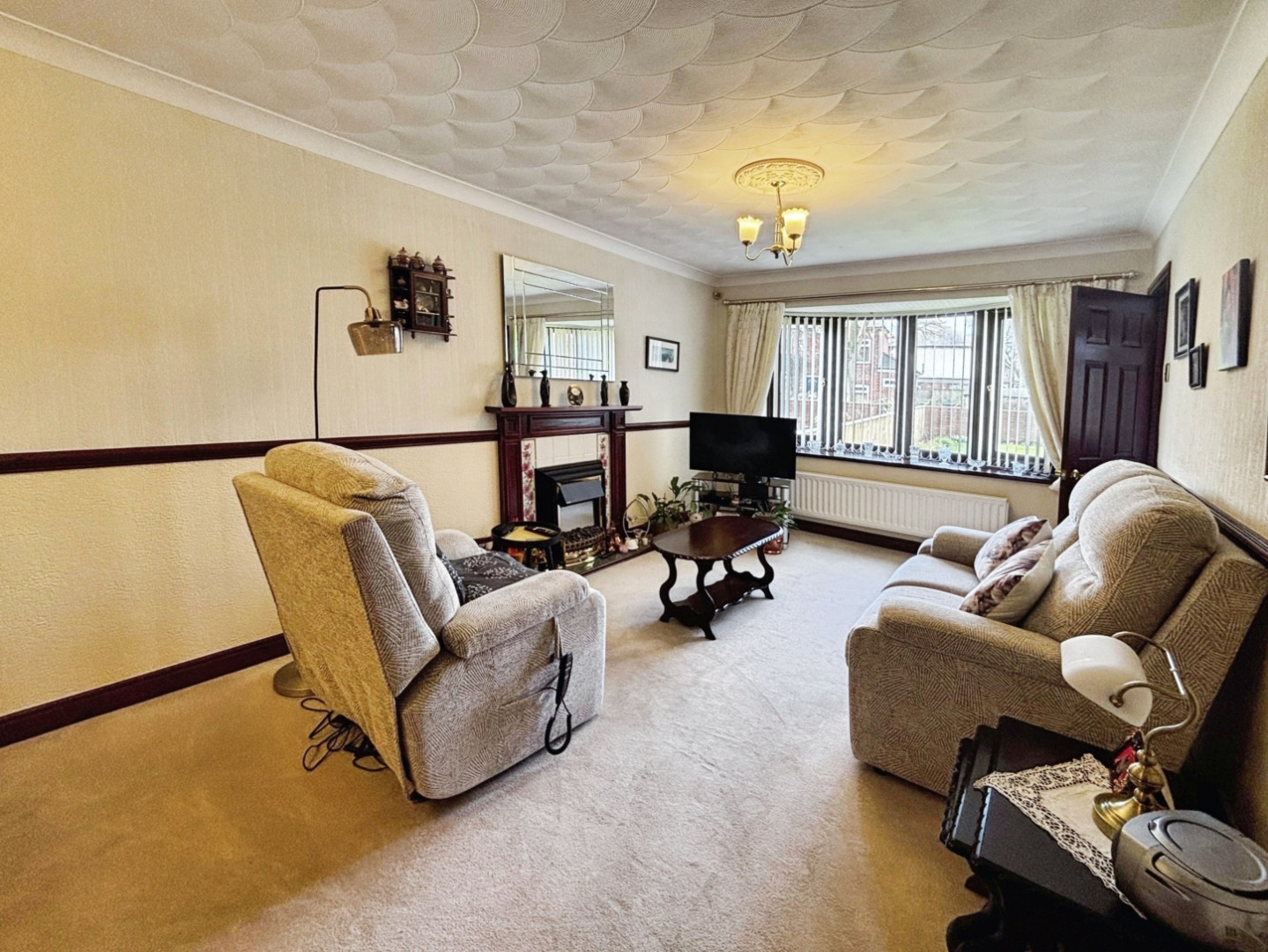 Having a feature fireplace with electric fire, double central heating radiator and upvc bow window to front.