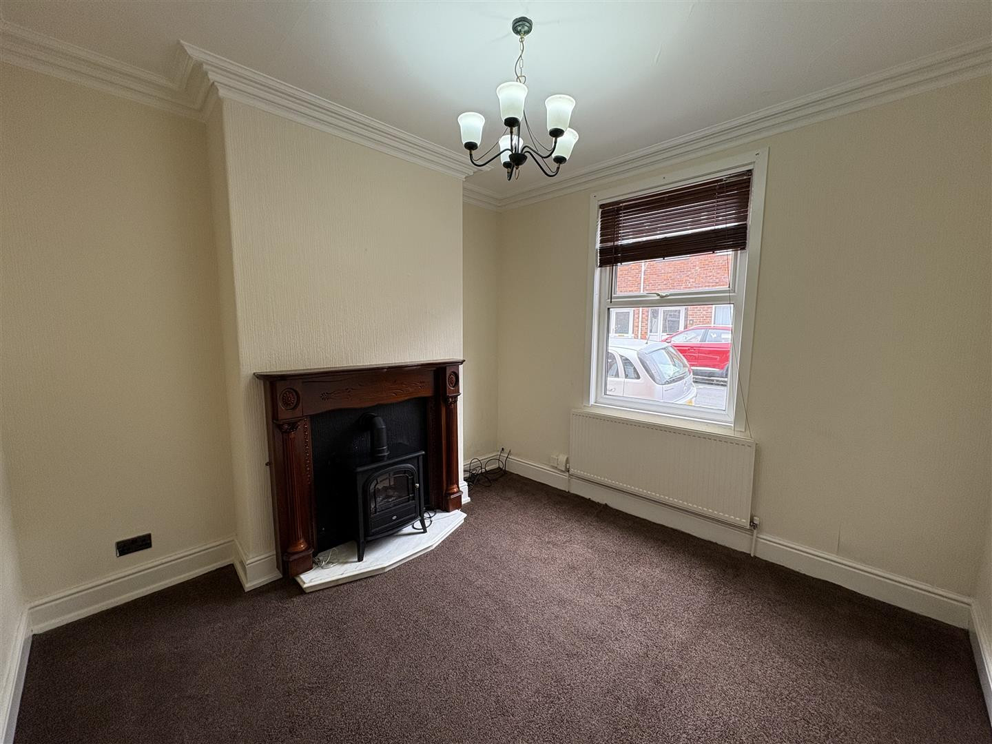 Upvc double glazed window to front, deep coving to ceiling, electric log burner and radiator.