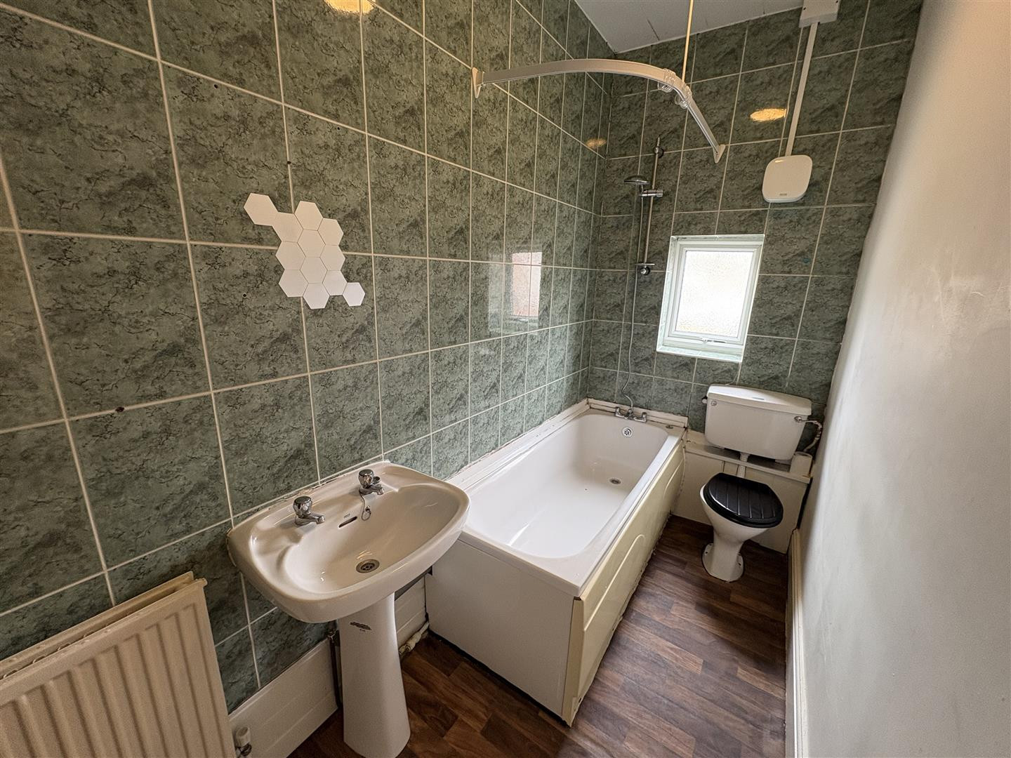 Upvc double glazed obscure window to rear, bath with shower over, w.c, wash hand basin and radiator.